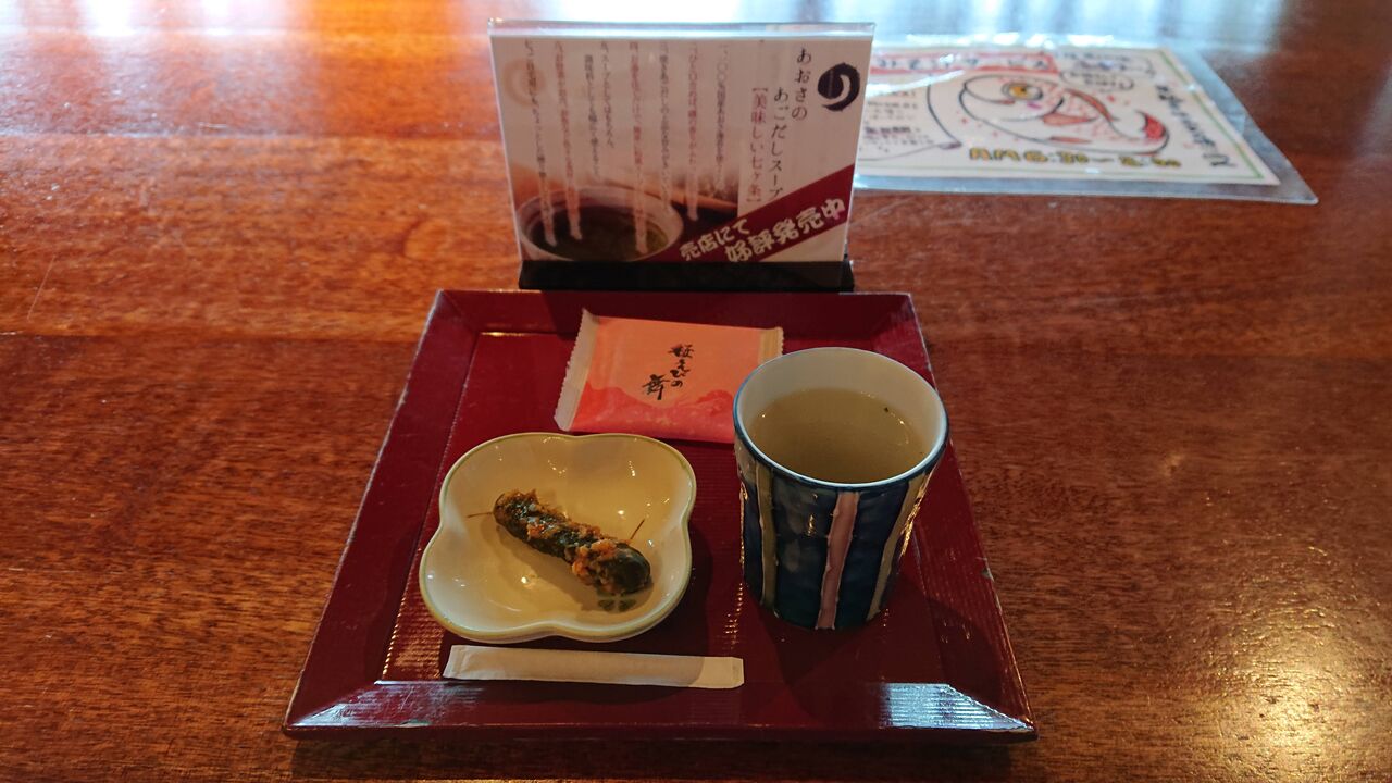この日は、あおさとあごだしスープ、桜エビ煎餅、きゅうりの味噌漬けでした。