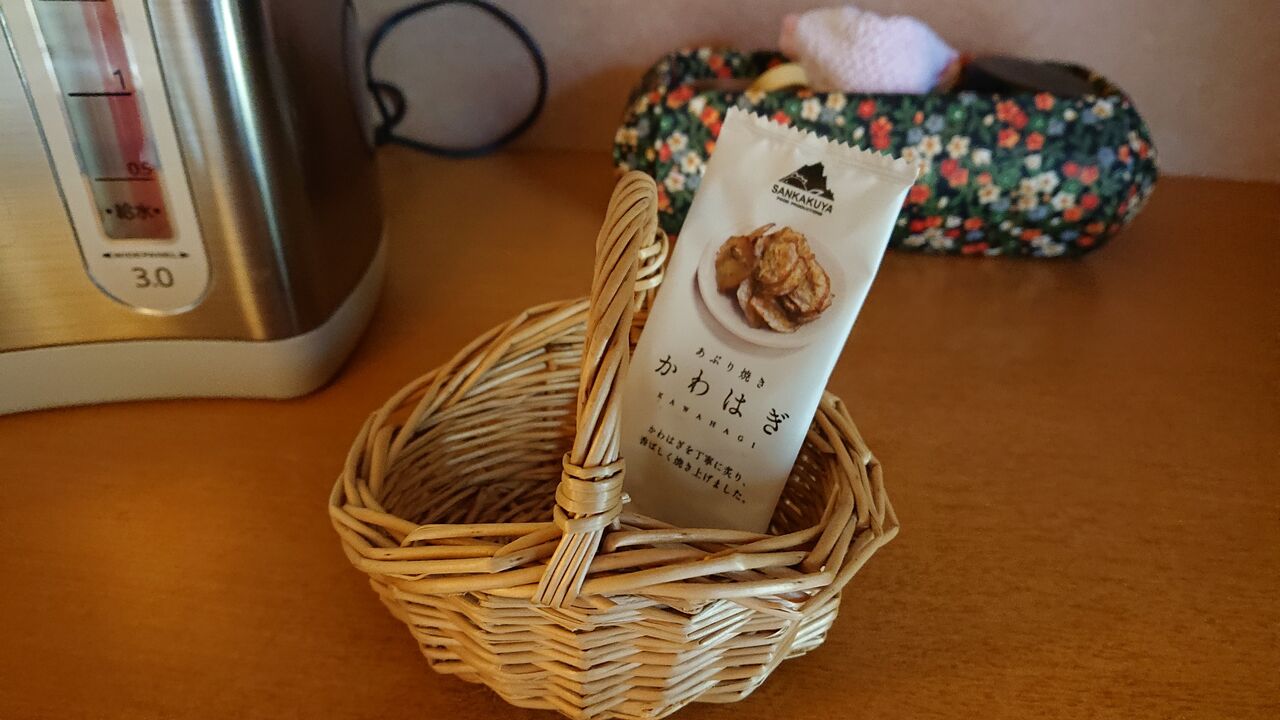 お茶菓子を頂きます。宿帳の記入はなく、この場でスタッフから予約内容確認が行われます。