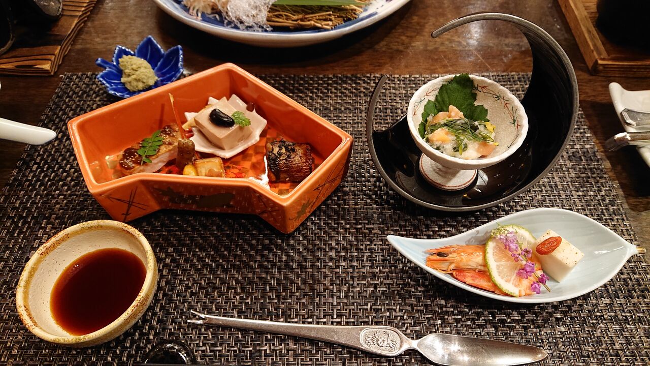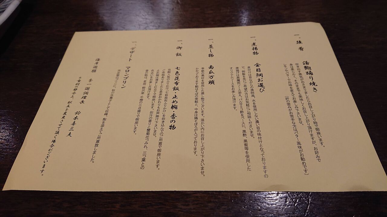 夕食での、刺身の魚・金目鯛の調理法のチョイスが、ちょっと楽しい気分にさせます。