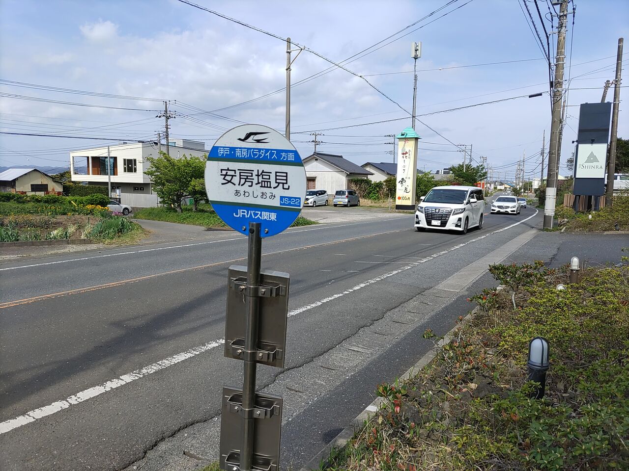 館山駅西口から路線バスで約20分。安房塩見バス停に到着です。