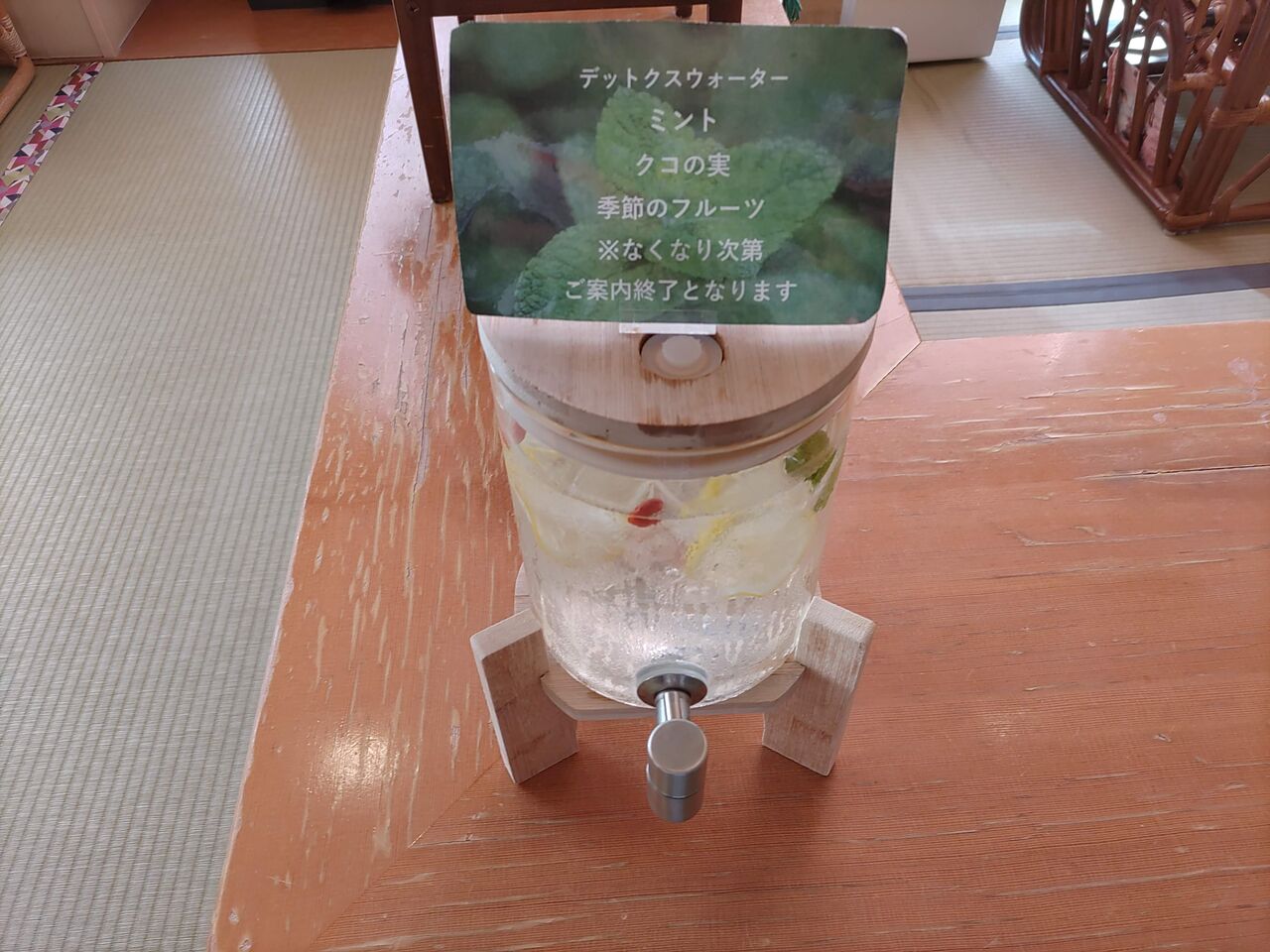 湯上がり処には、デトックスウォーターが用意されていました。