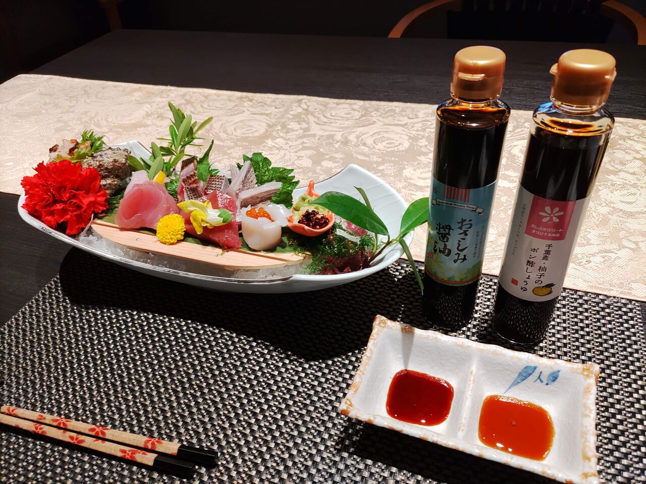 花しぶきリゾートオリジナルの、刺身しょうゆ、ポン酢しょうゆとともに。