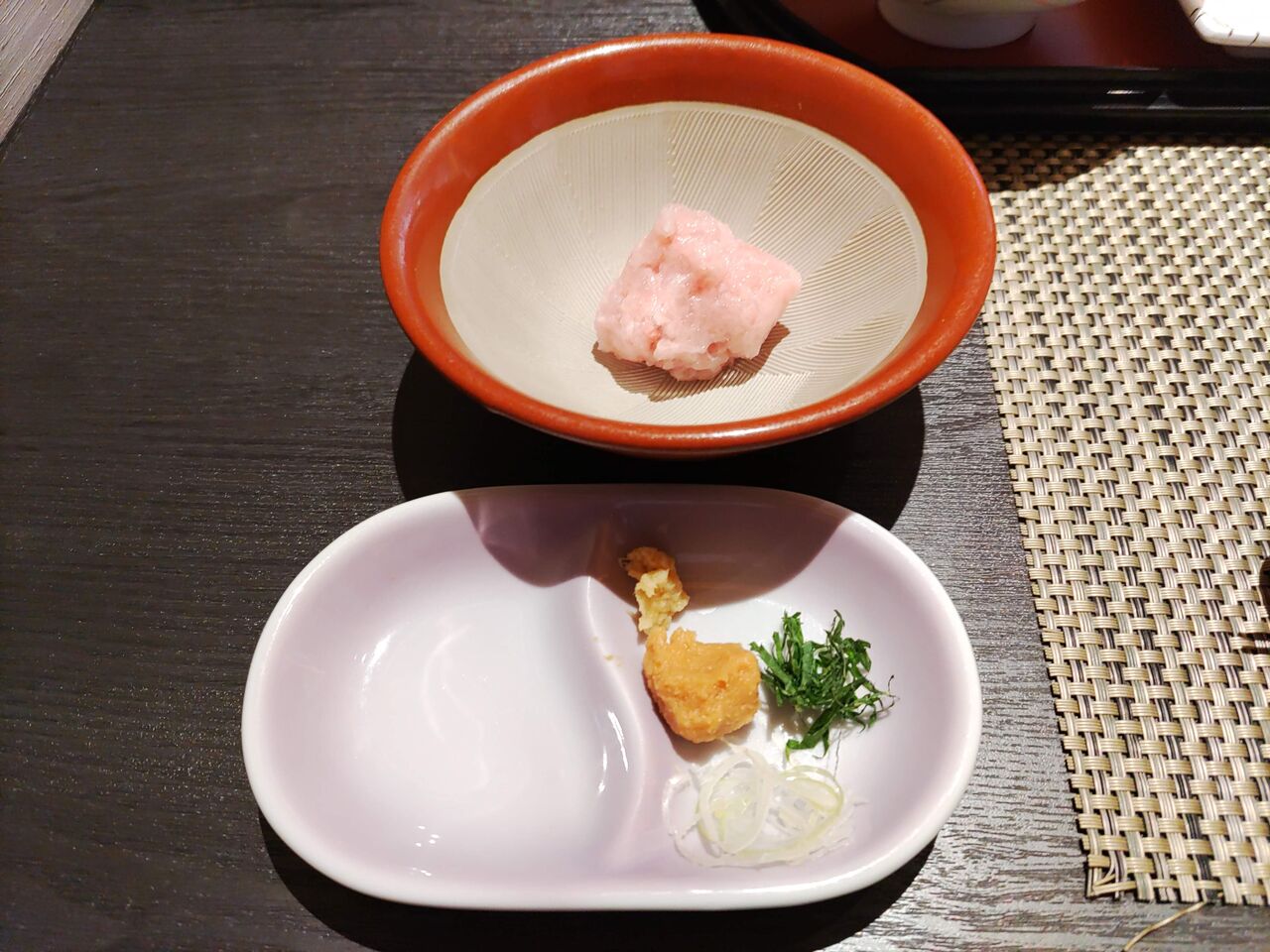 自分で作るなめろう、蟹の味噌汁。