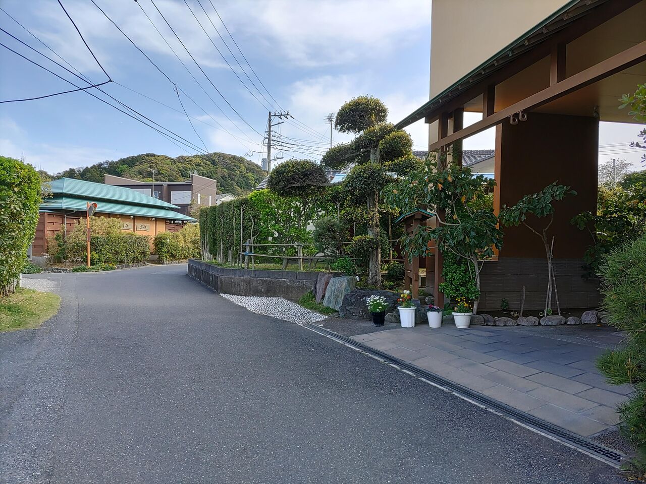 民家の間の細道を歩いて行くと、花しぶきの建物の頭が見えてきました。