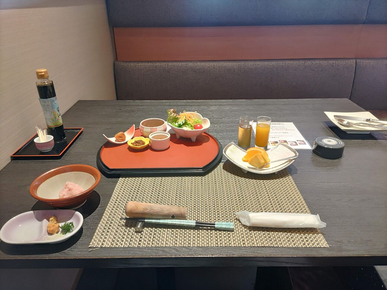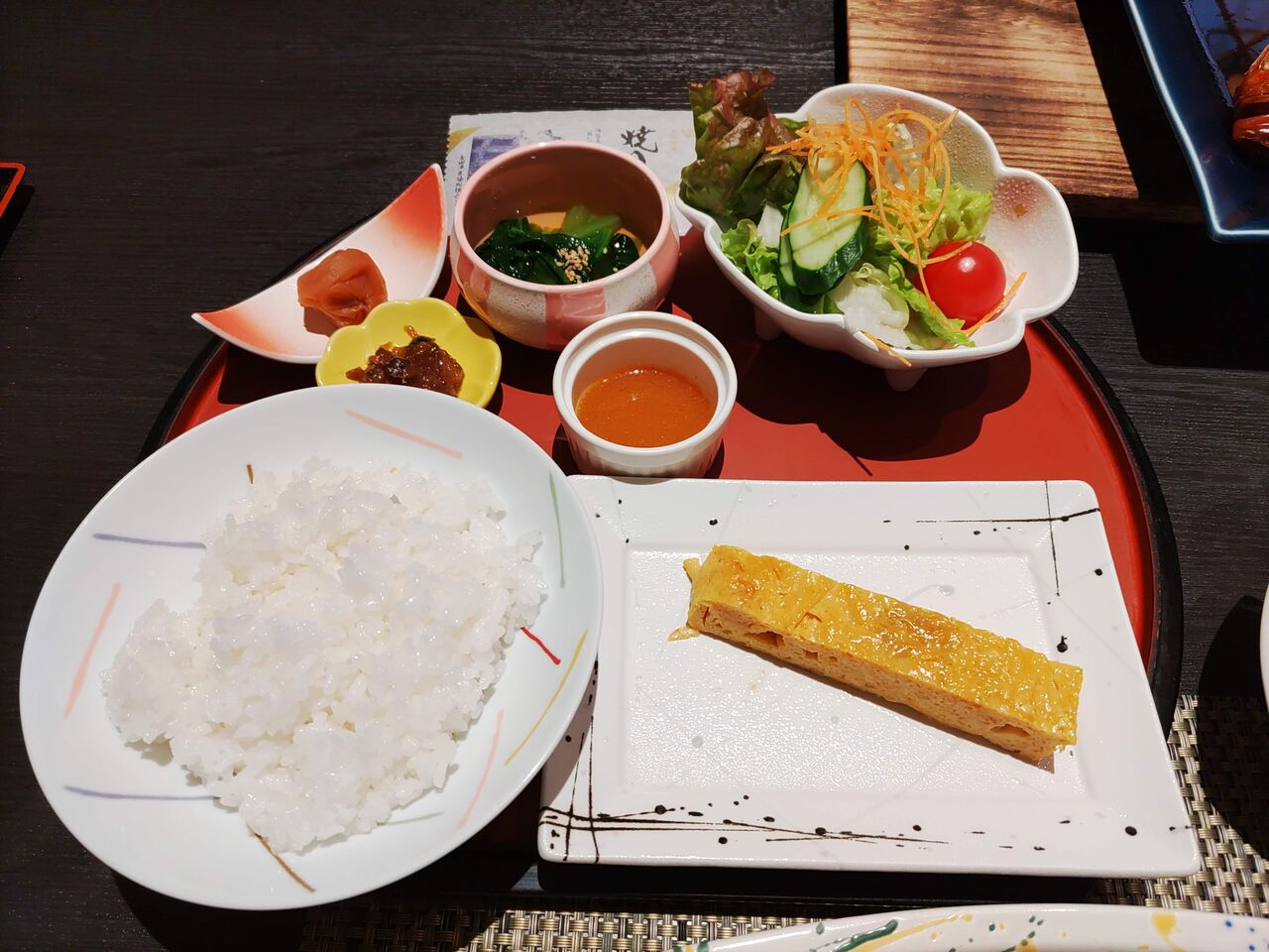 サラダ、おひたし、焼海苔、梅干、玉子焼き。