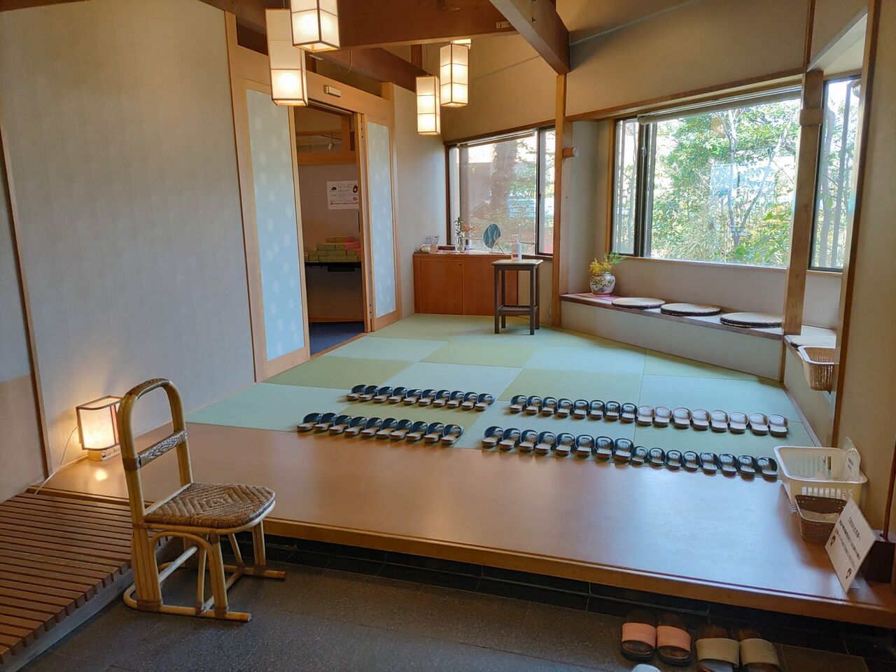 着替え用の個室は、座布団に座ってくつろげるスペース。