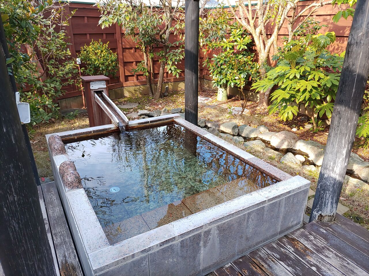 源泉掛け流しの表示の露天風呂。