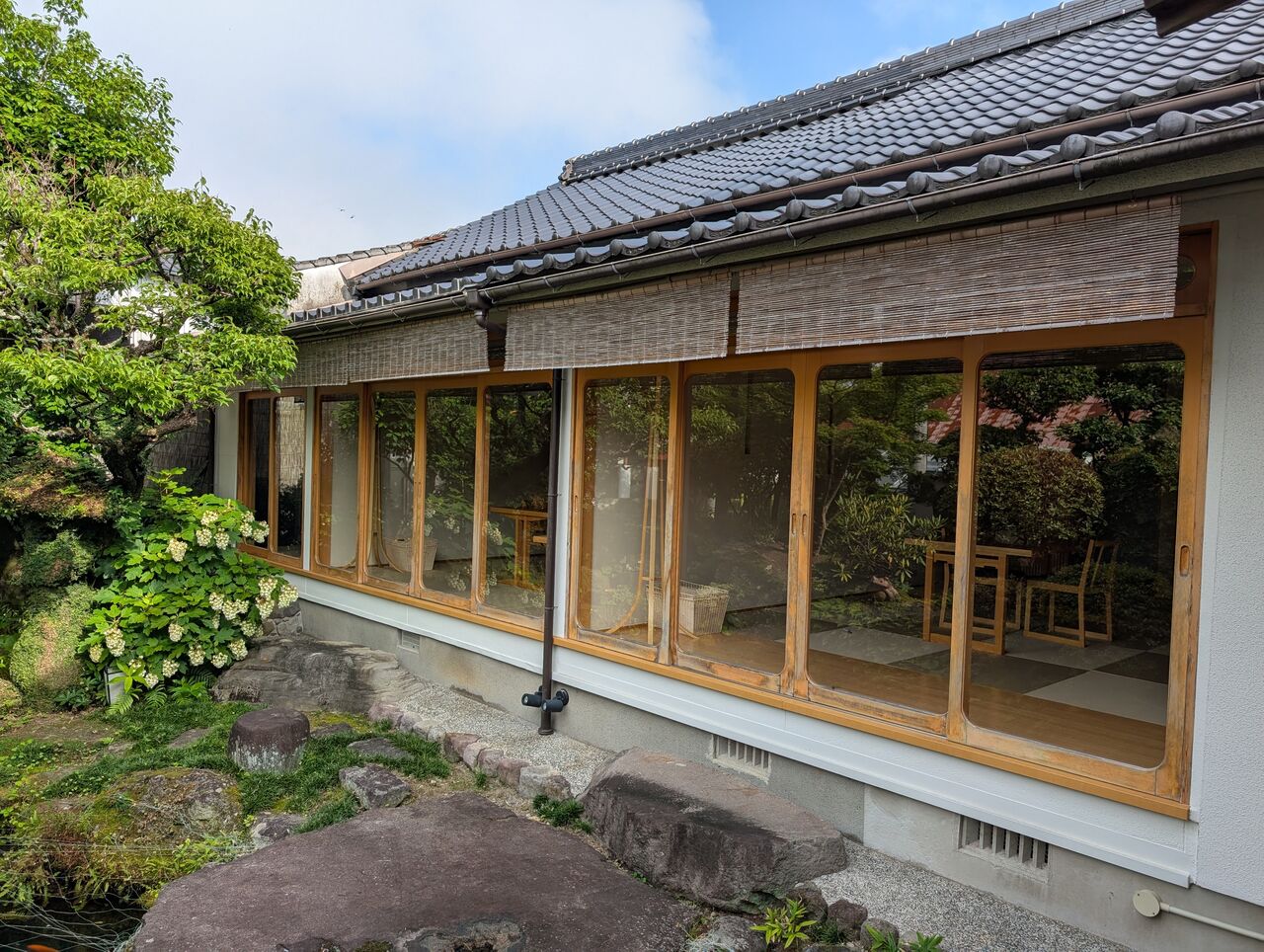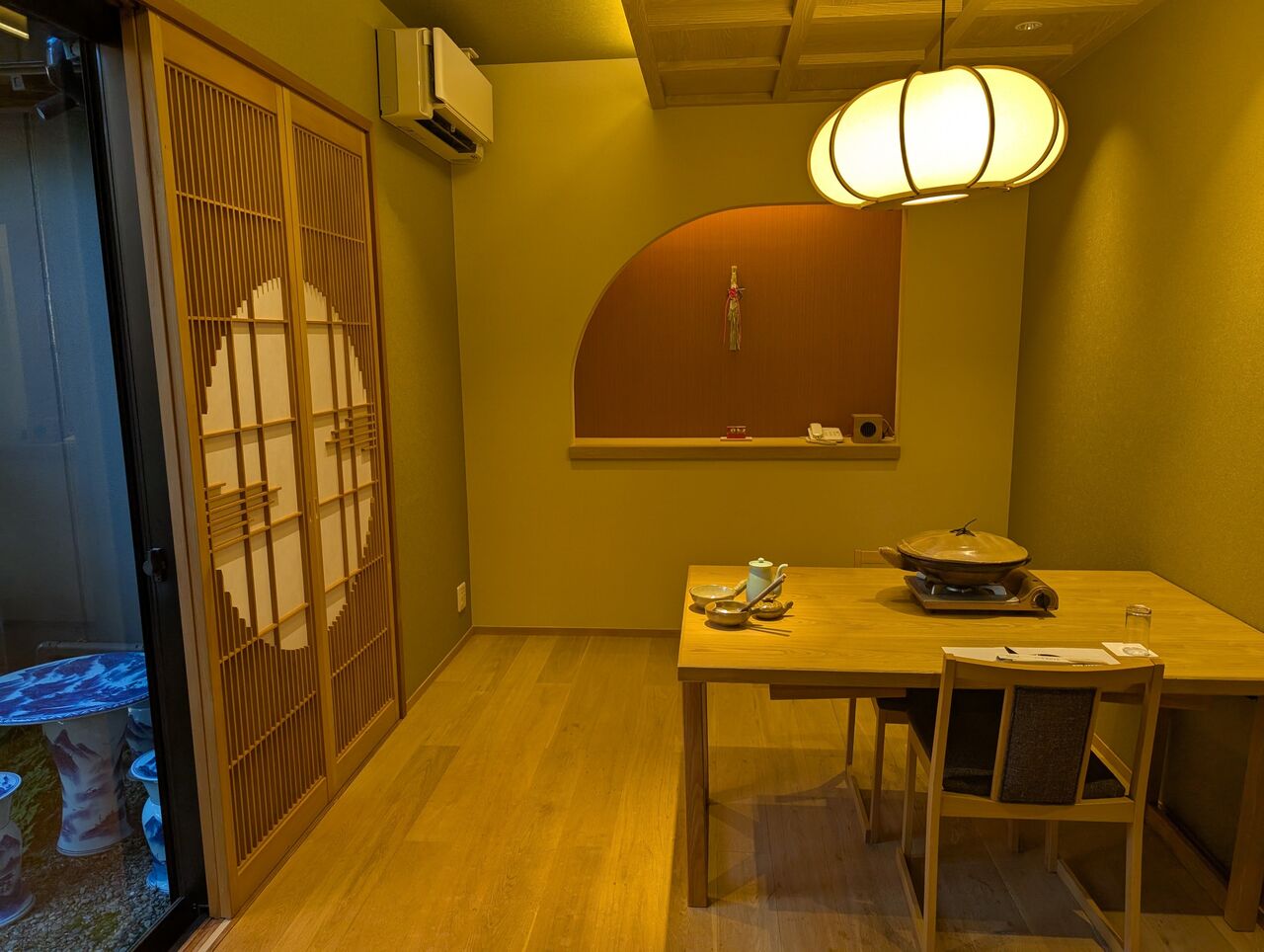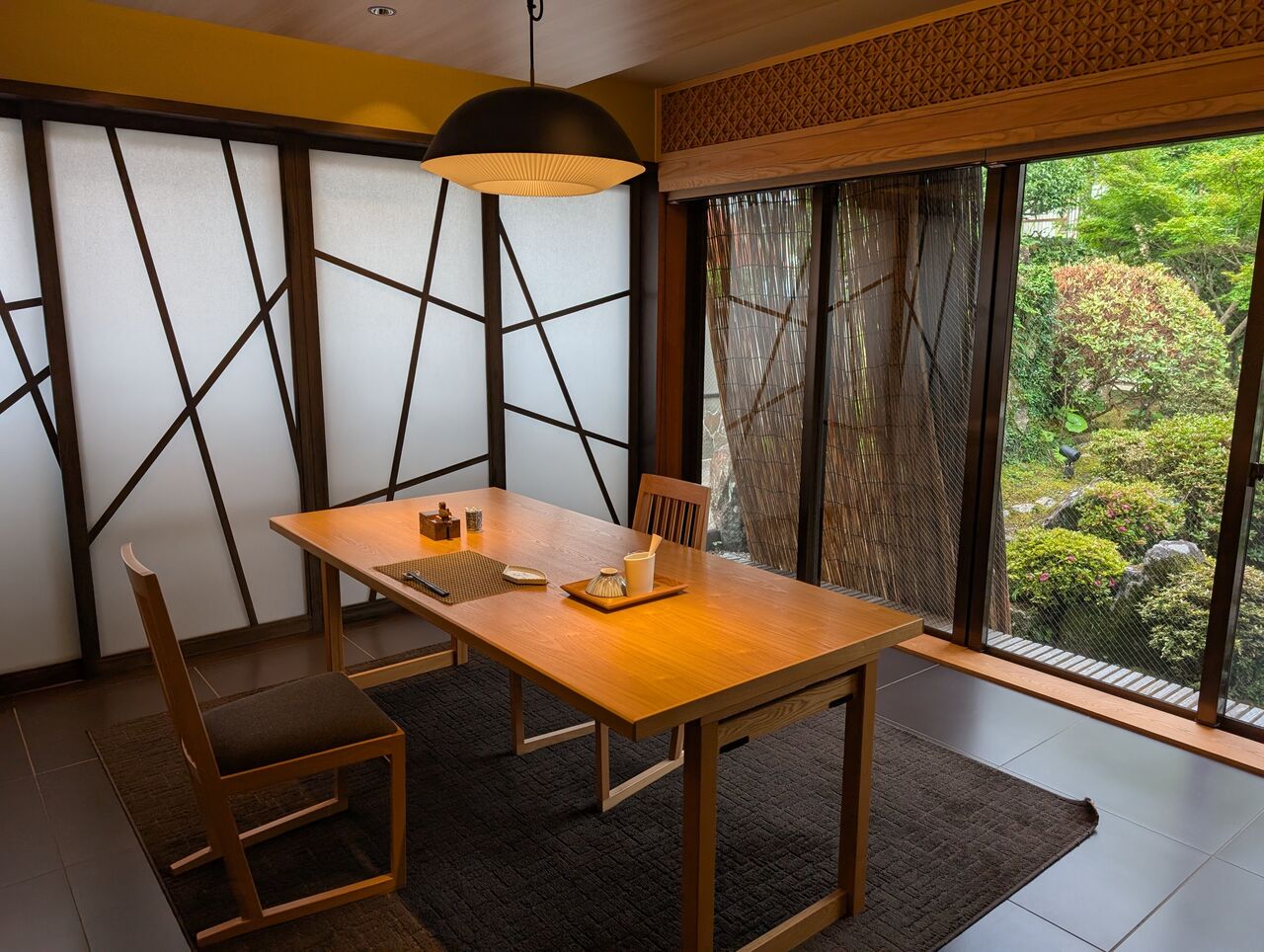 庭の池に面しており、窓からは右手に別の個室食事処が見えます。