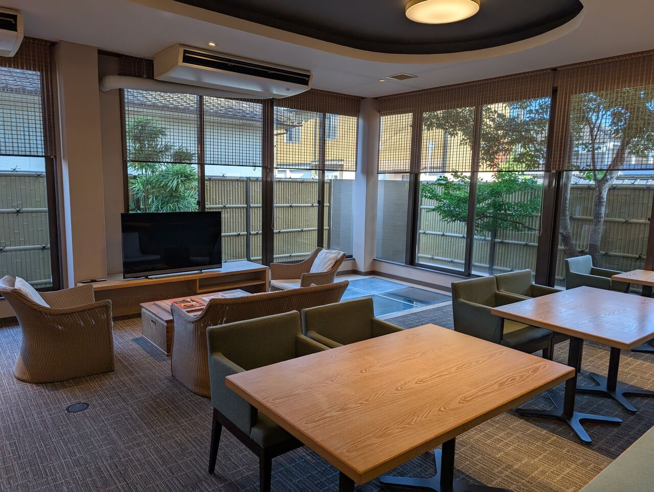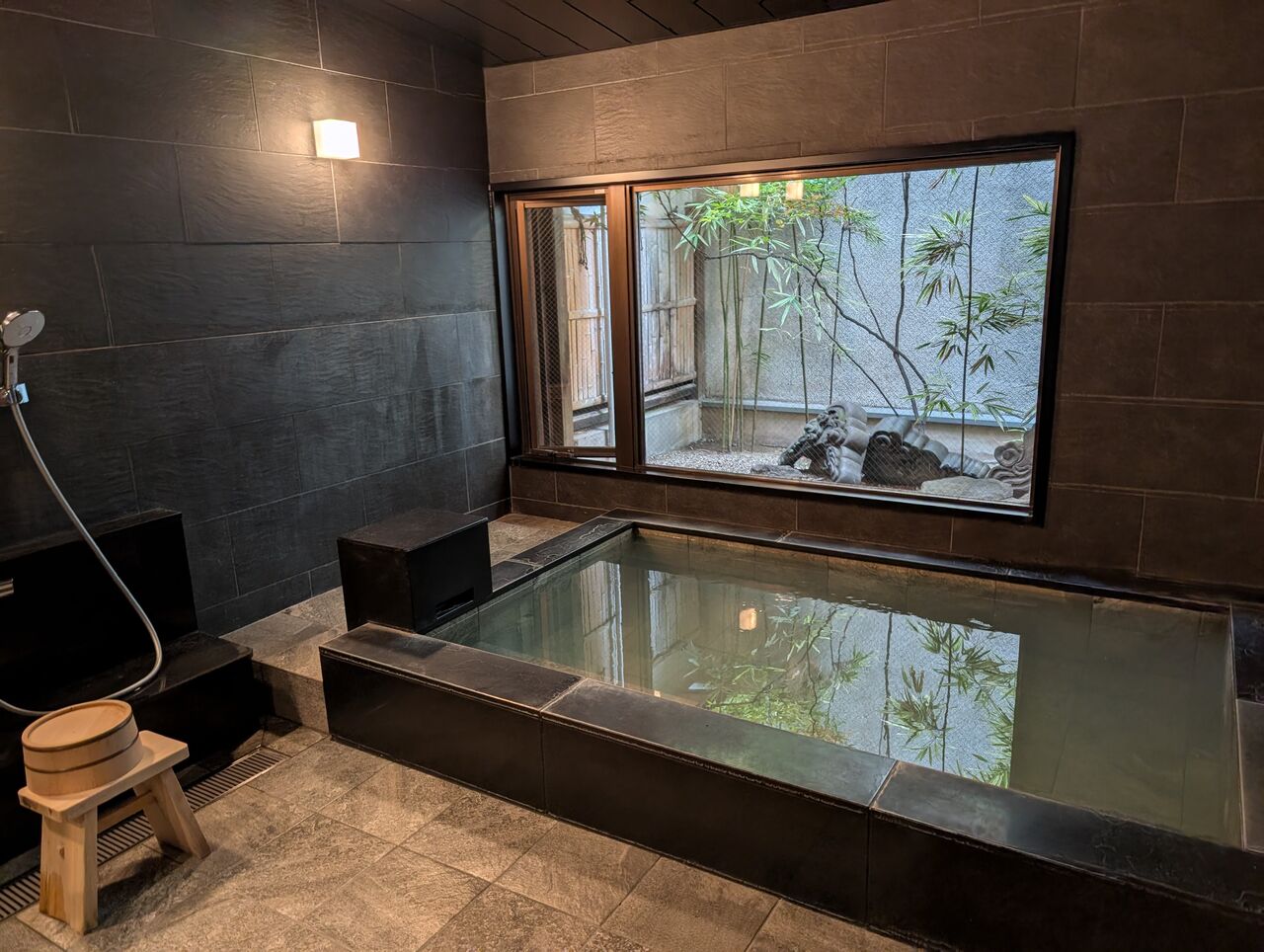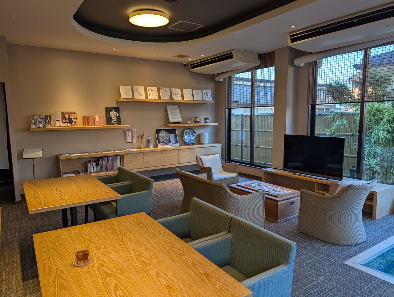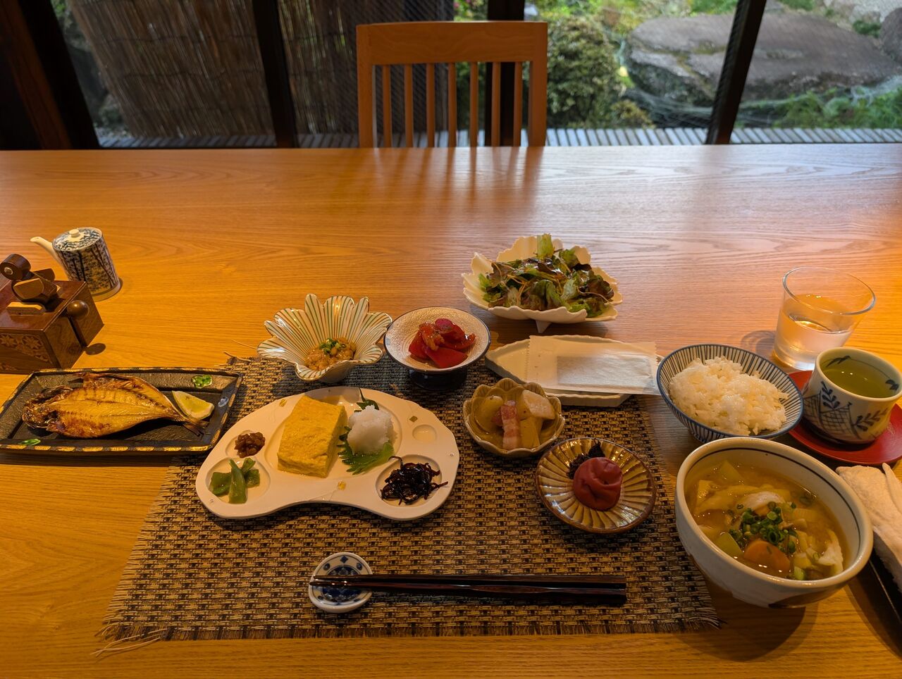 庭の池に面しており、窓からは右手に別の個室食事処が見えます。
