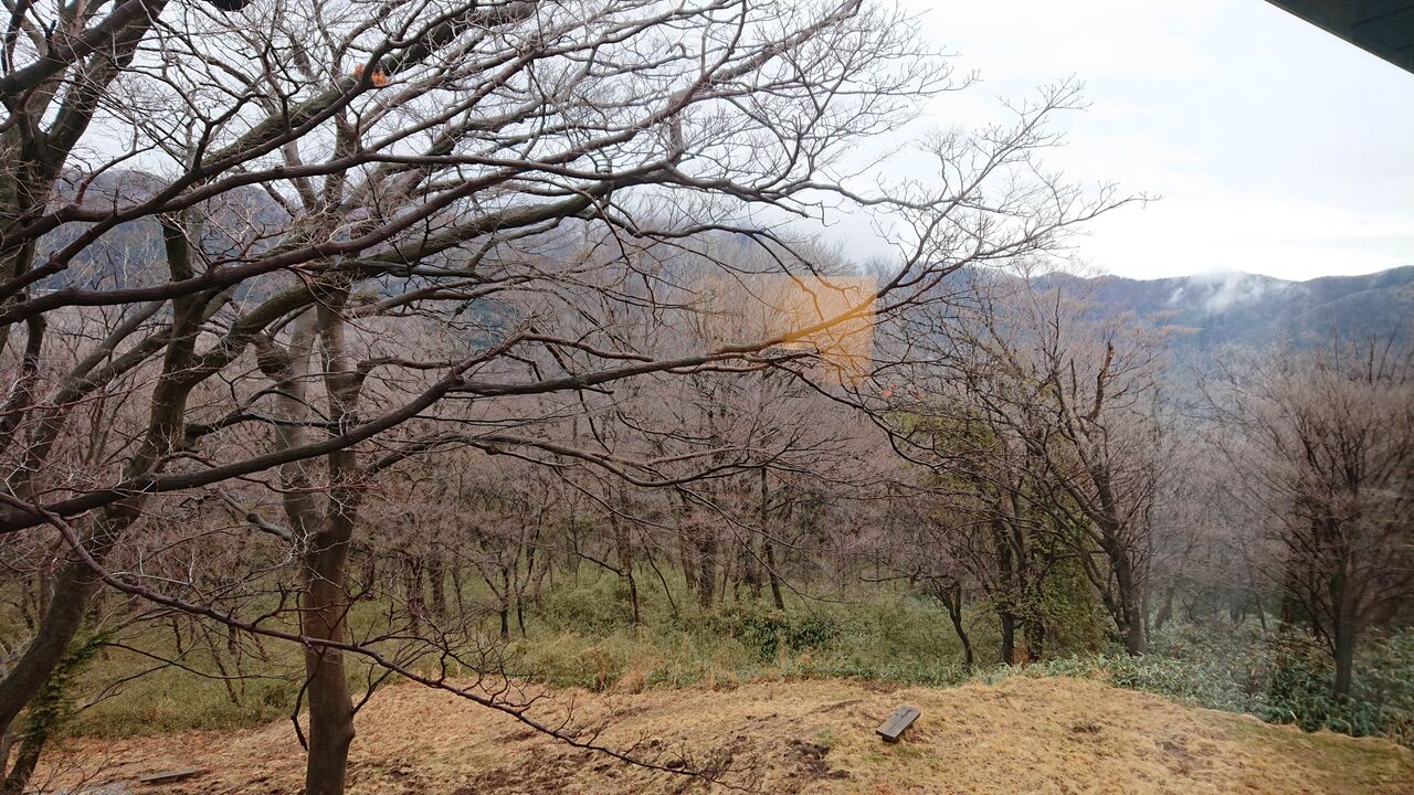 窓からの景色は、林の先に山々です。