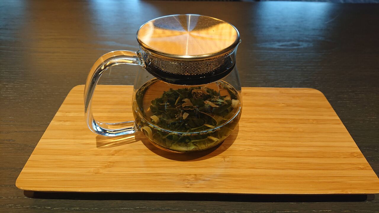 和スイーツの玉水晶と、緑茶をベースにしたハーブティー。