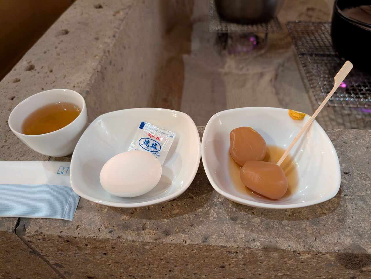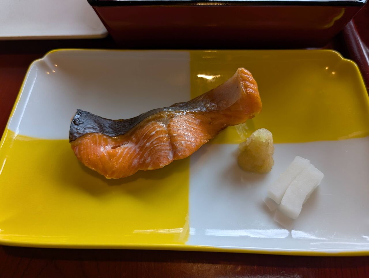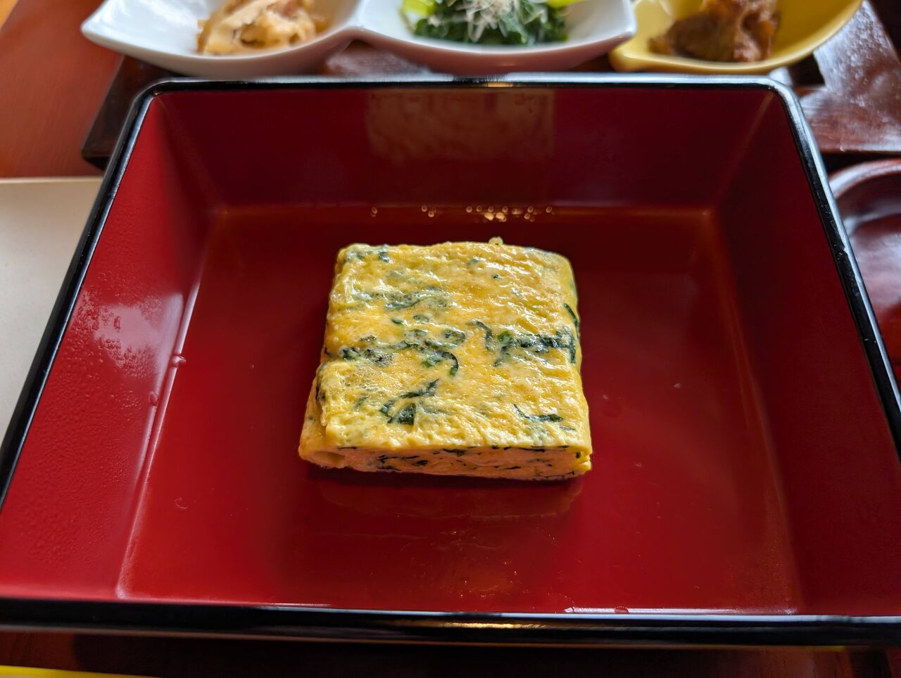 だし巻き・宮城サーモンの塩麹焼き・煮物は、ほのかに温かい状態で提供され、