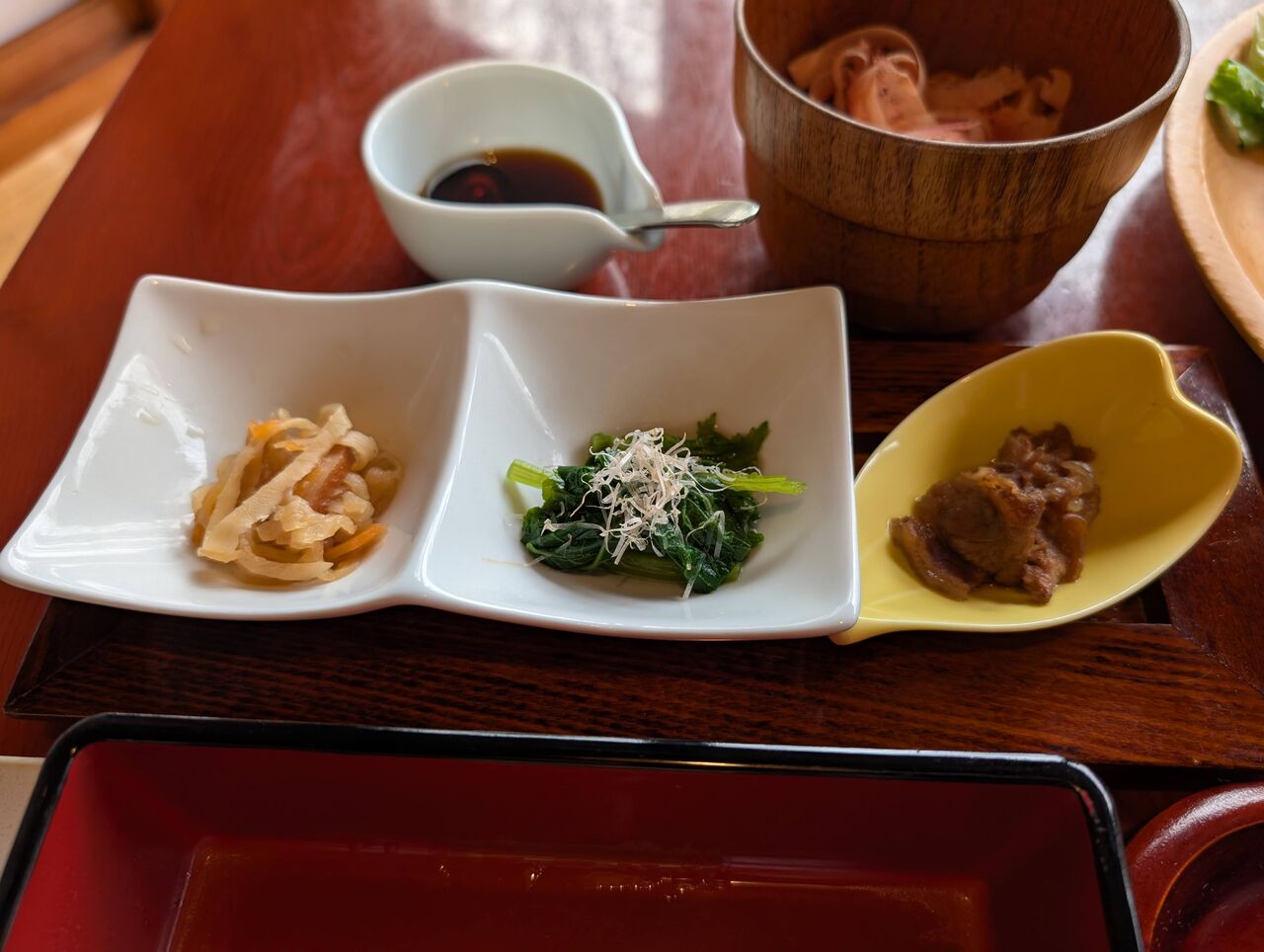 仙台牛のしぐれ煮、つぼみなのおひたし。切り干し大根。