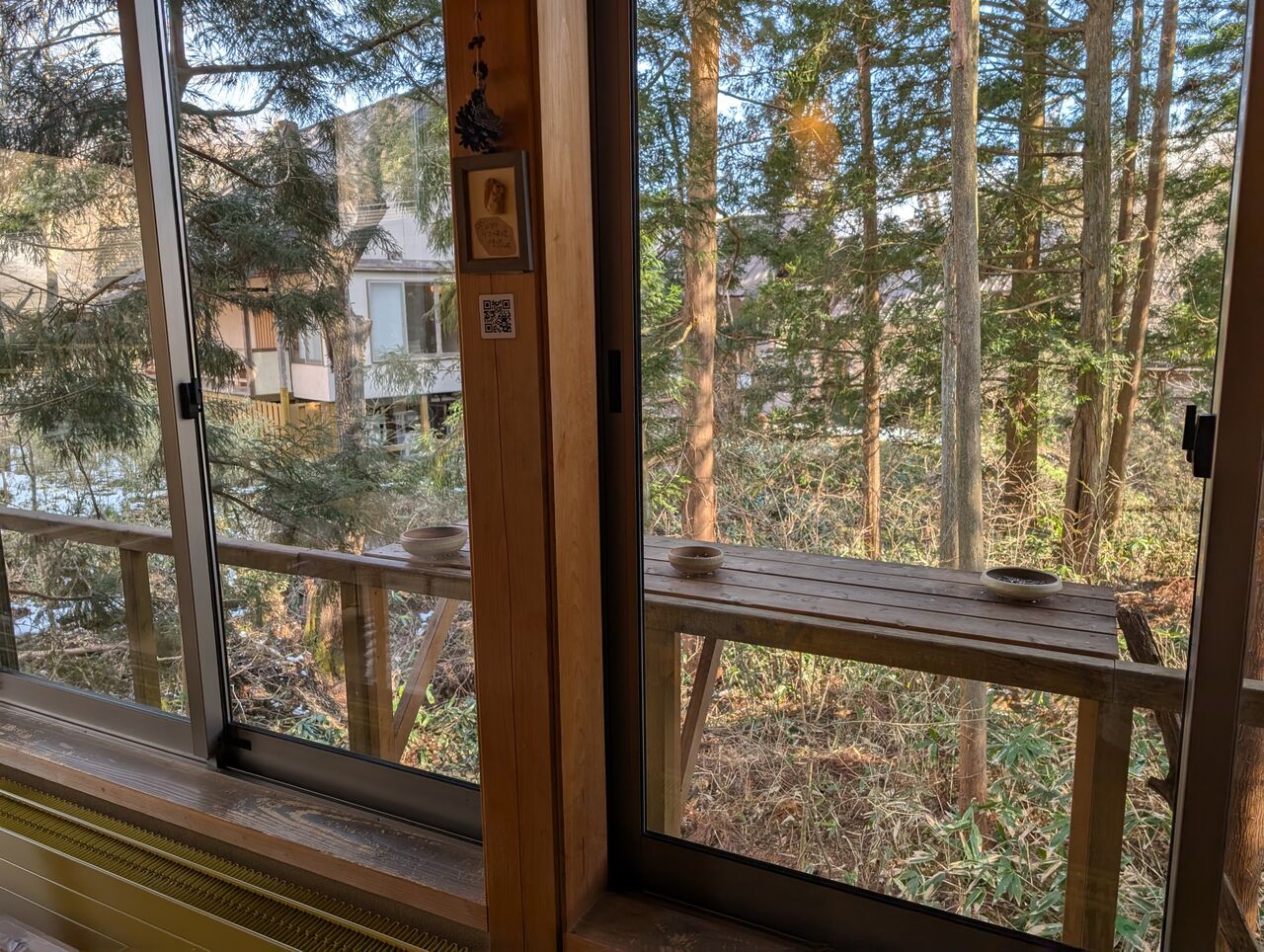 窓の外にはえさ棚。小鳥やリスが寄ってくるそうです。