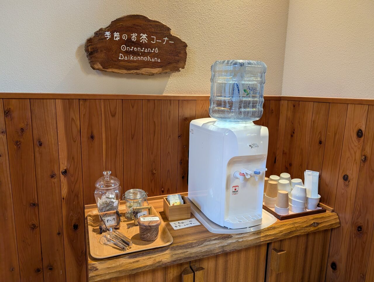 夕食時のドリンクがフリー。小とりサロンでは、ソフトドリンクやお菓子がいつでも置いてあり、