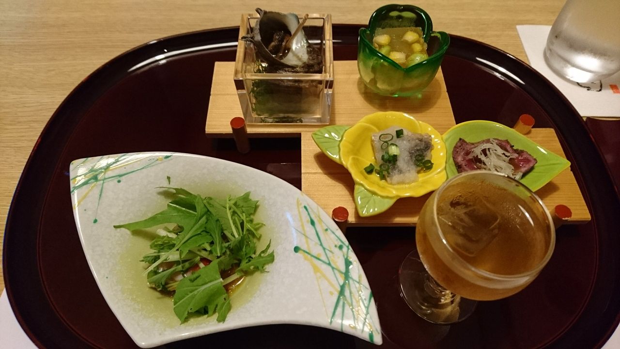 前菜 旬彩ゼリー 平政オイル漬け 鯵霙酢 牛たたき 姫栄螺