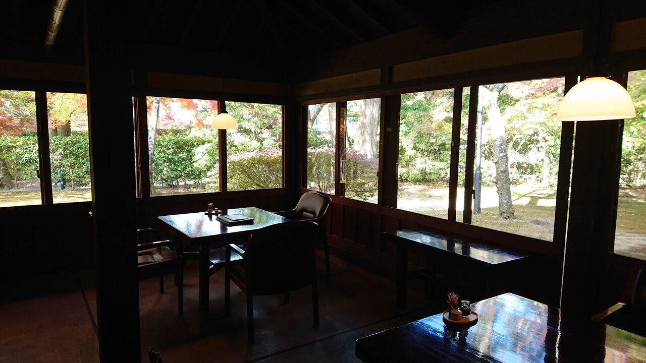 窓の外は、絵画のような景色。ちょうど紅葉で色付きだした木々がきれいです。