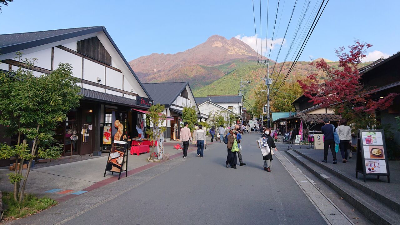 ここからは、由布岳を正面に道が延びていて、土産物や食べ物屋がたくさん。