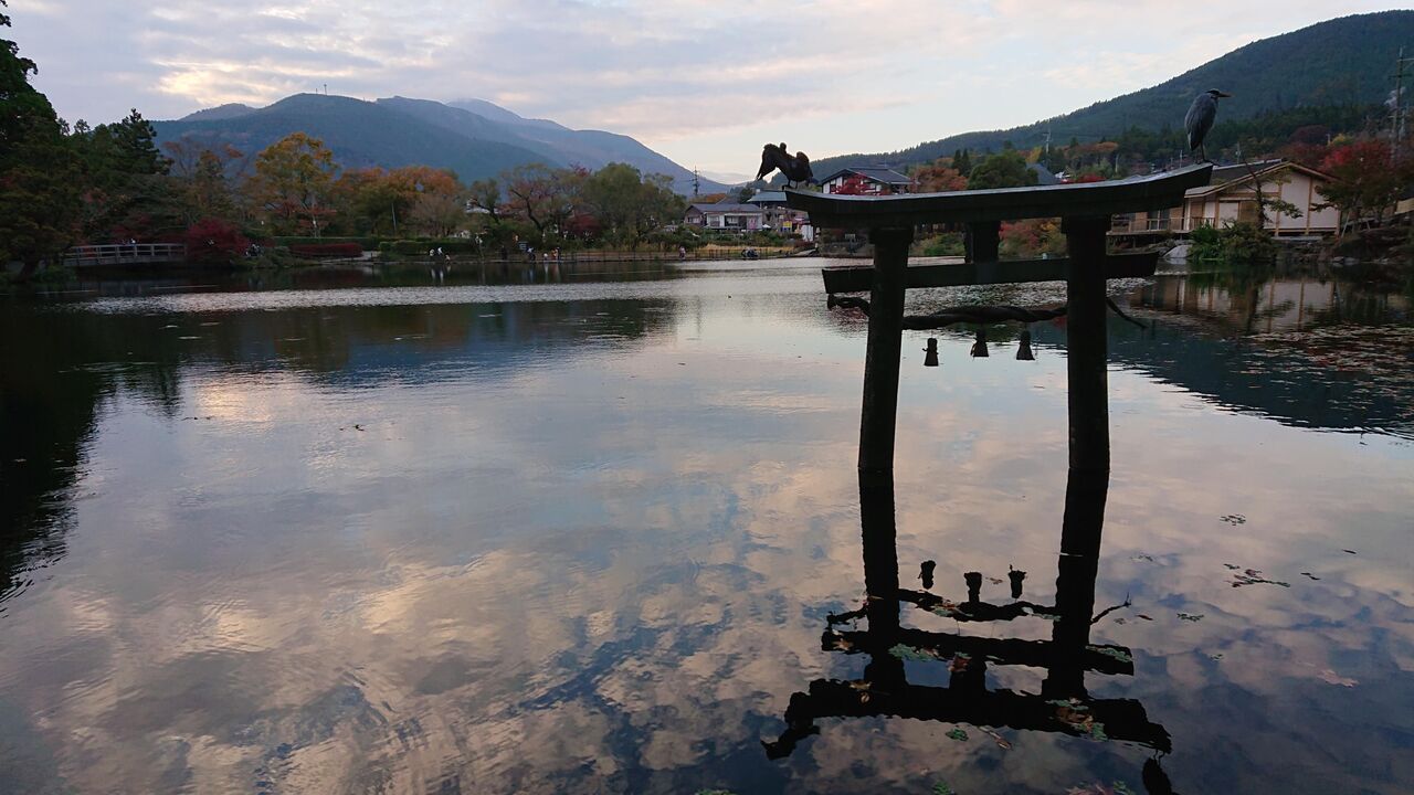 鳥居の上には鷺。水面に映った鳥居、向こうにはなだらかな山。