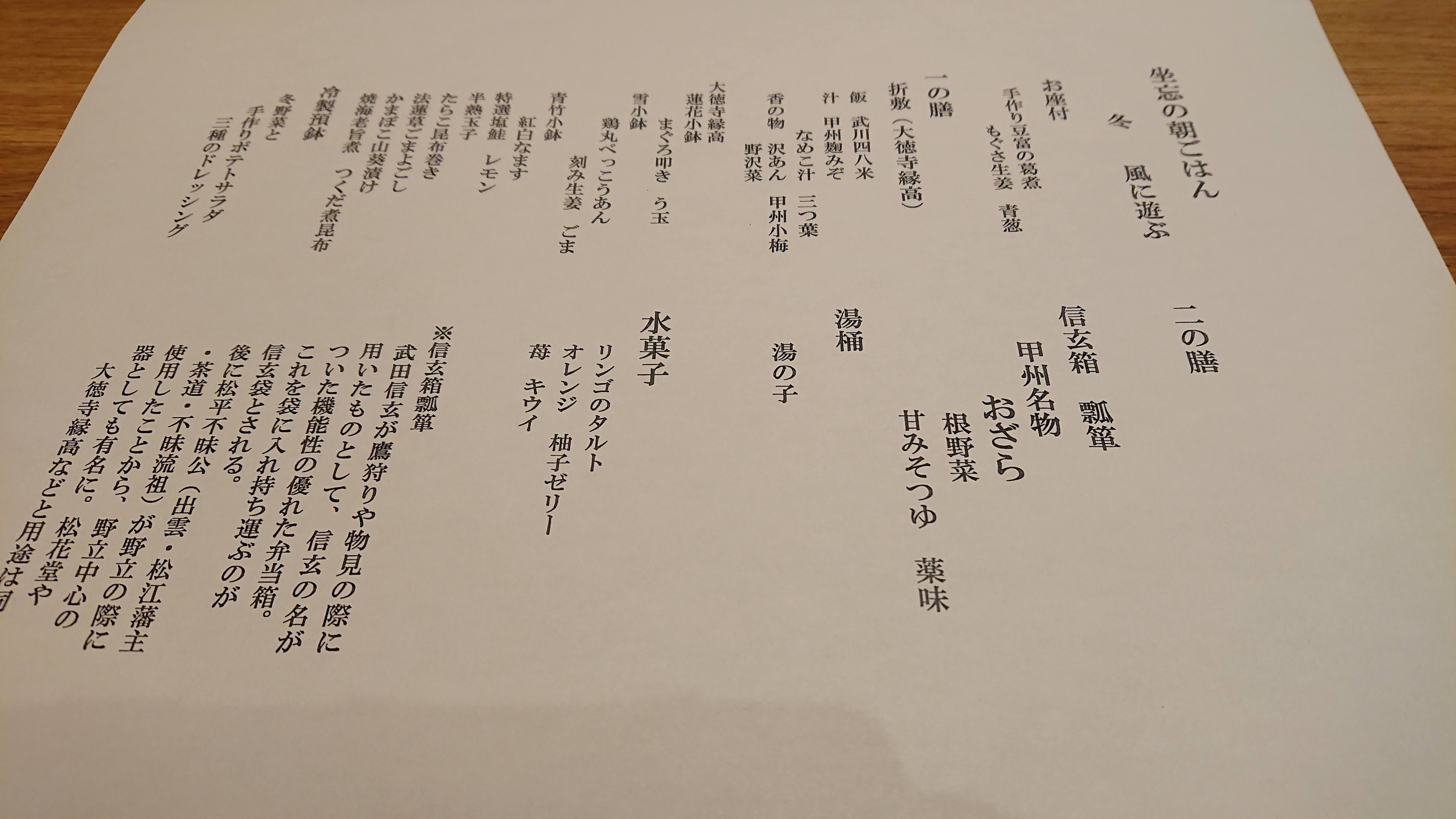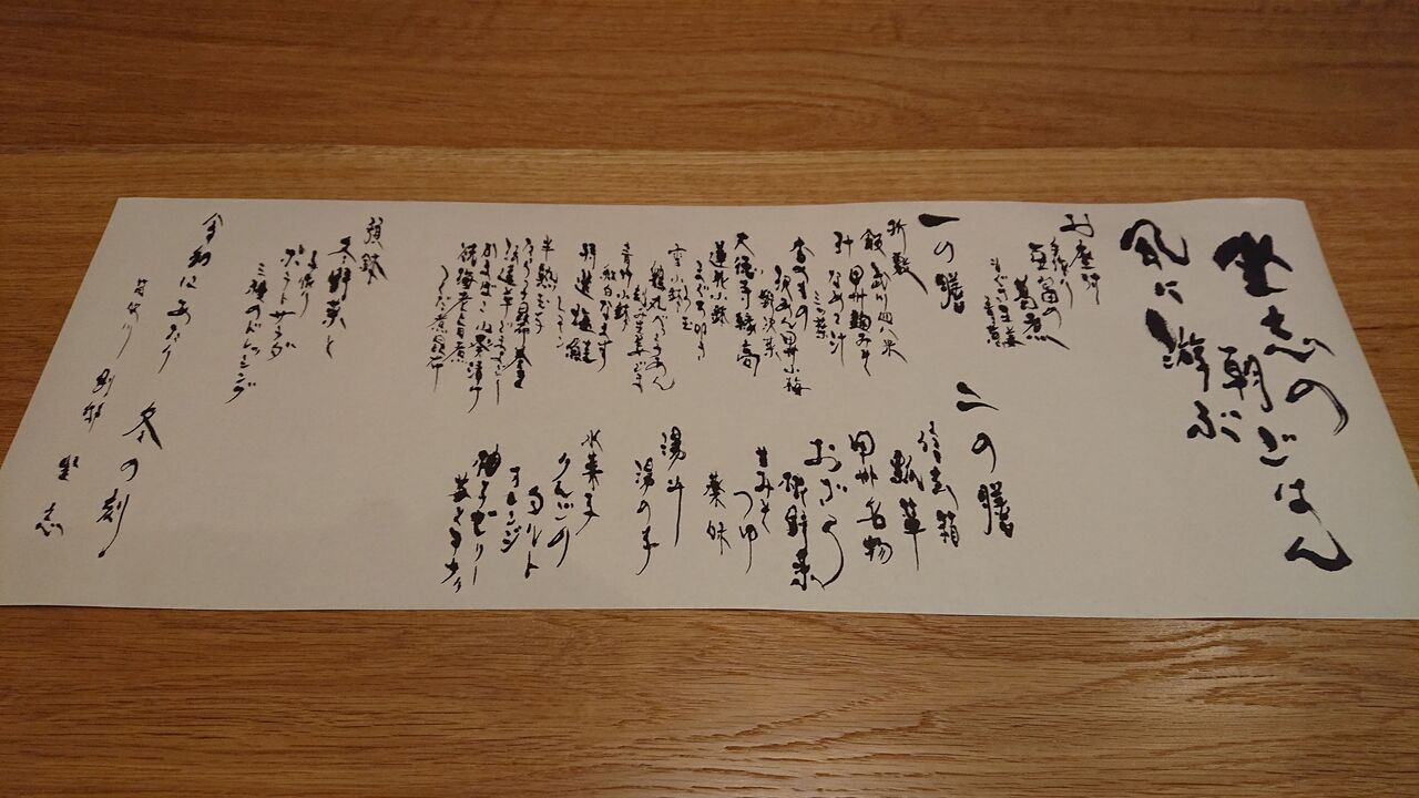 朝食にも、達筆のお品書き。