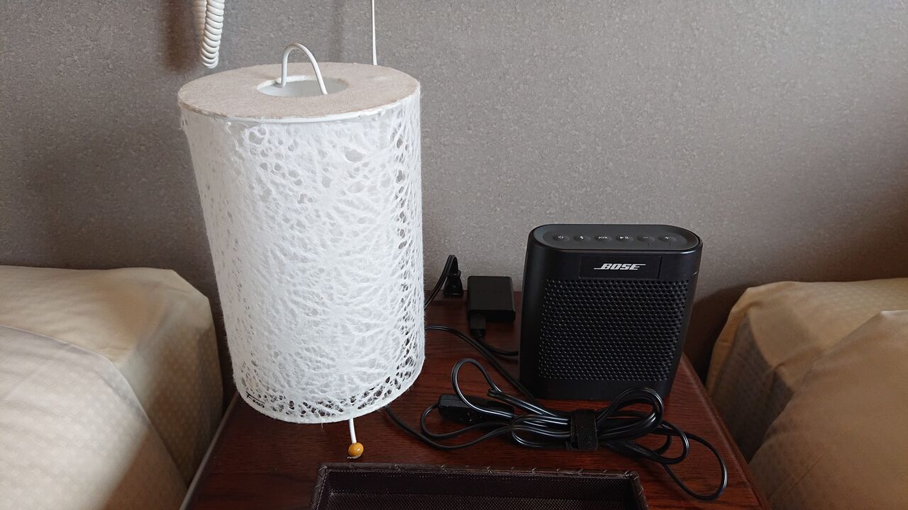 枕元には、Bluetoothスピーカー。