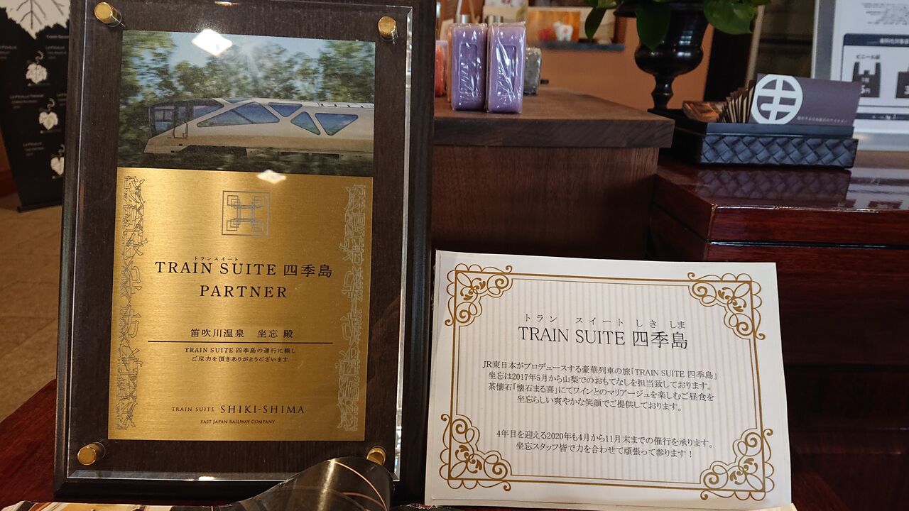 ロビーには、JR東日本のクルーズトレイン、TRAIN SUITE 四季島 に食事が採用されている展示。