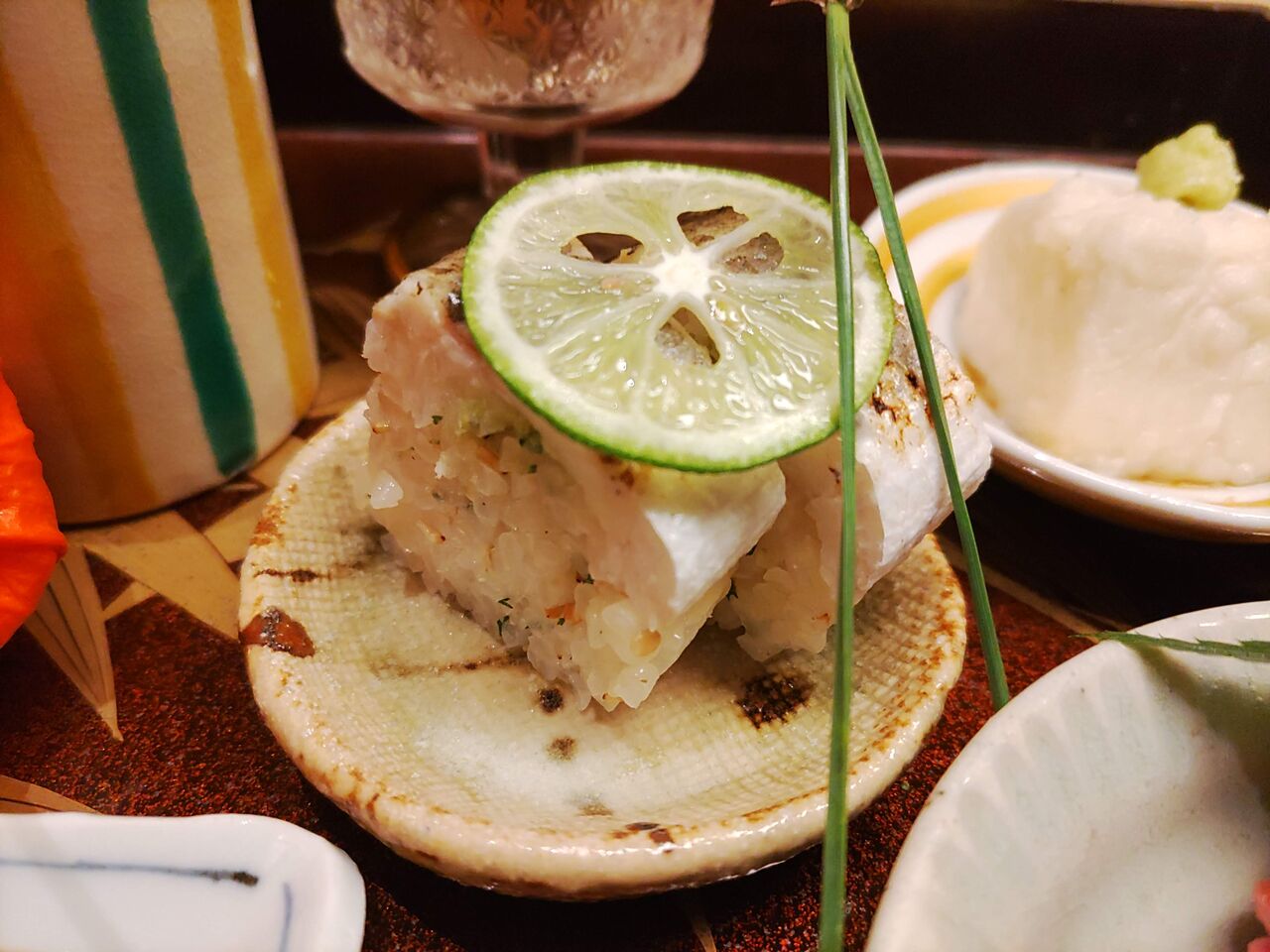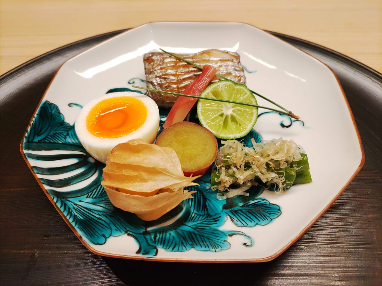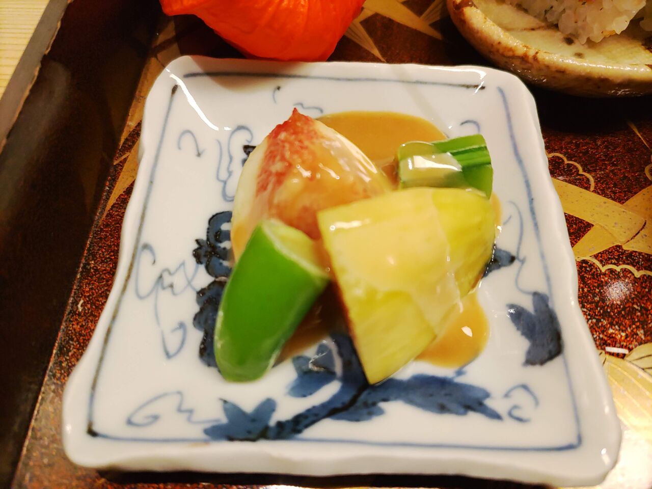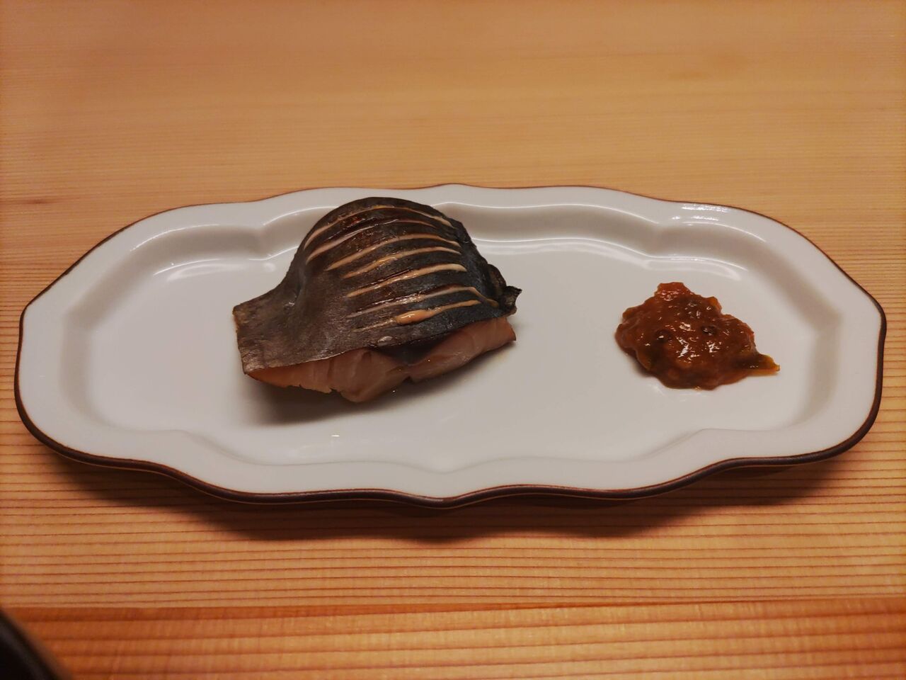 焼き物 鯵の幽庵焼き。お隣山中で作っている南蛮味噌。