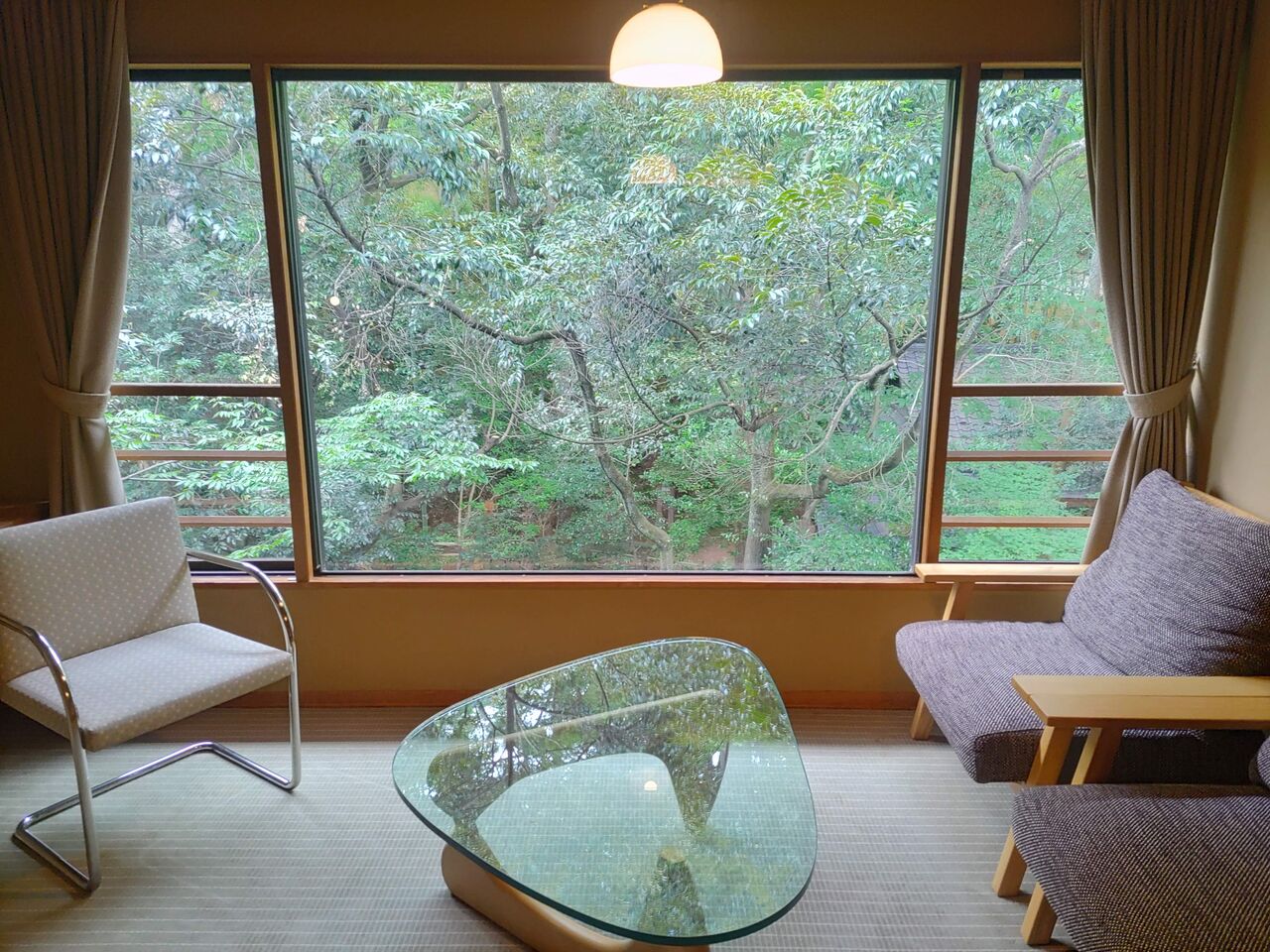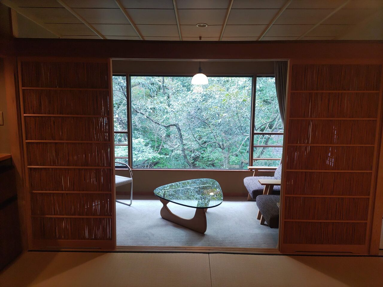 簀戸の先の広縁。窓からの景色は、敷地内の木々。