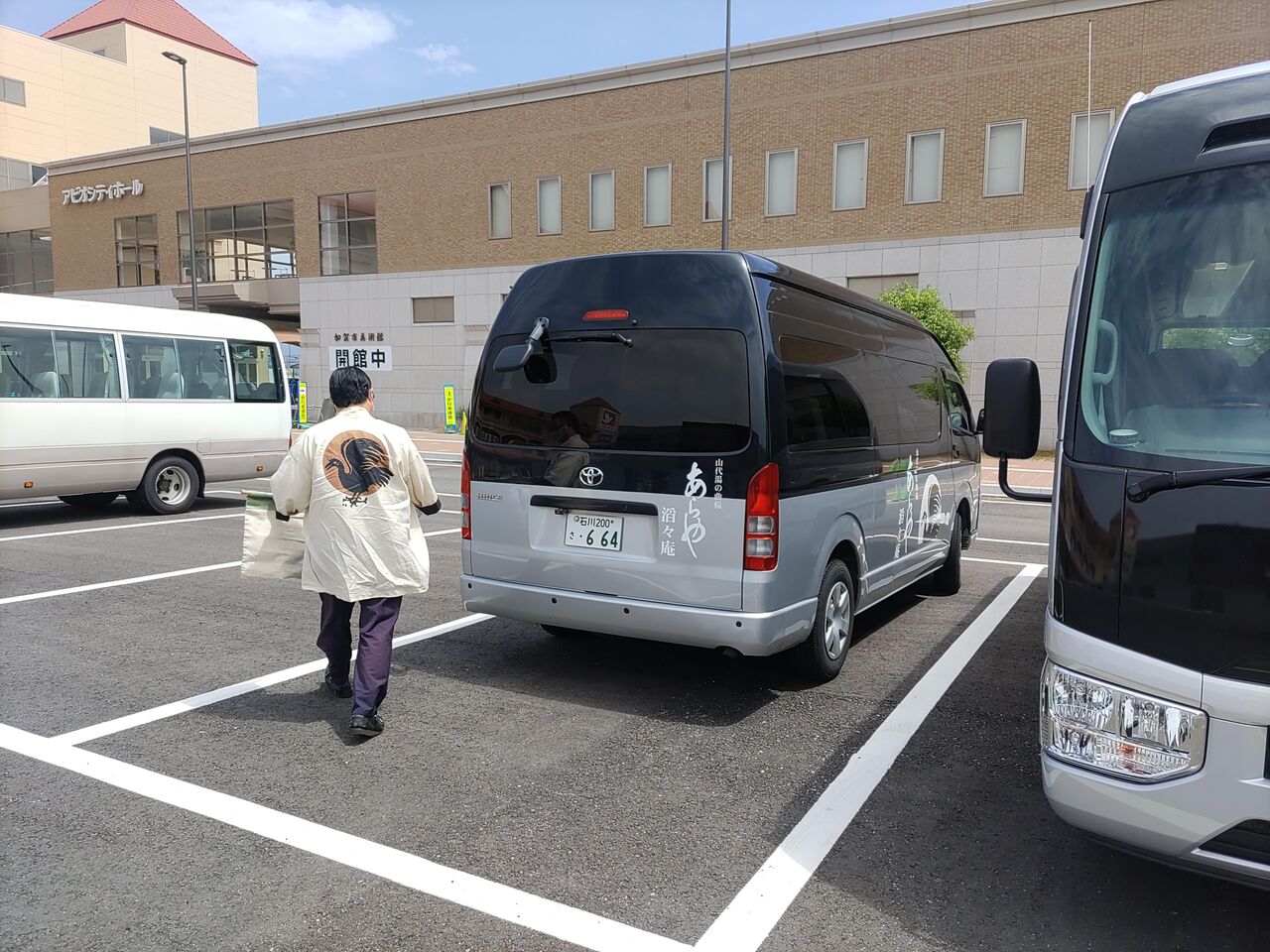 出発時間となり、仲居さんに荷物を持ってもらい、送迎車に。