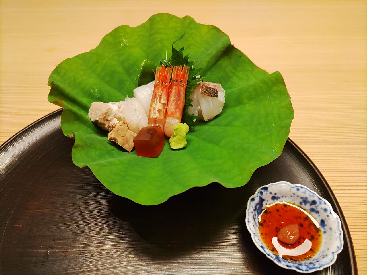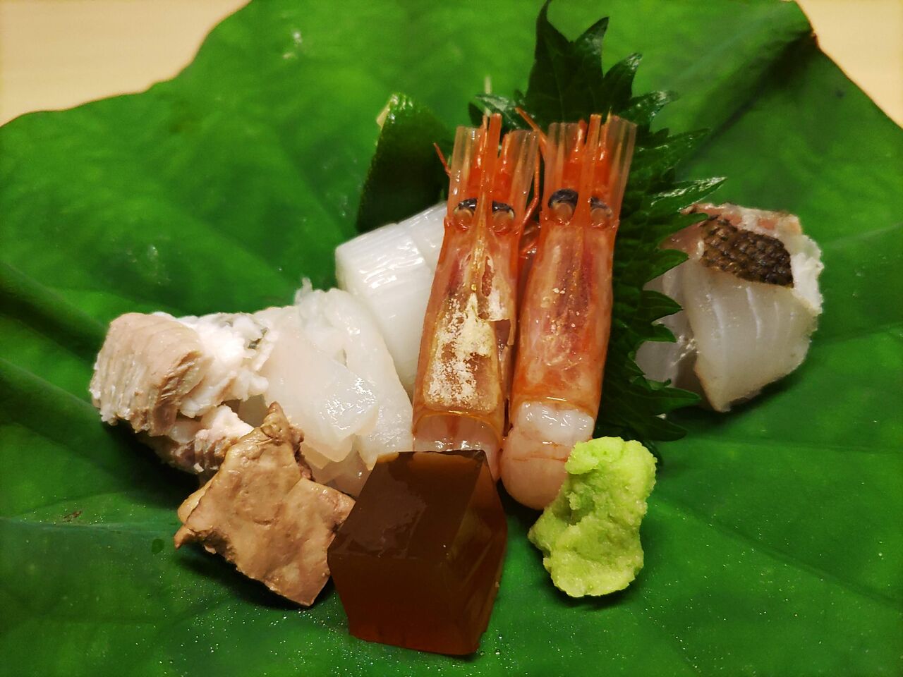 スズキの焼き霜、アカイカ、魯山人が好んだ食べ方:甘海老西京味噌漬け。