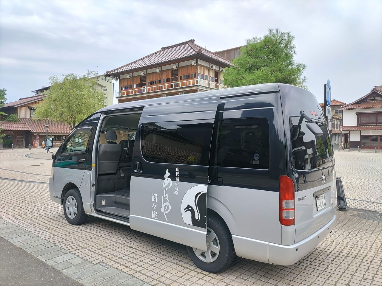 羽織のスタッフに迎えられて、黒塗りにあらや滔々庵のイラストが描かれた送迎車に乗り込みます。