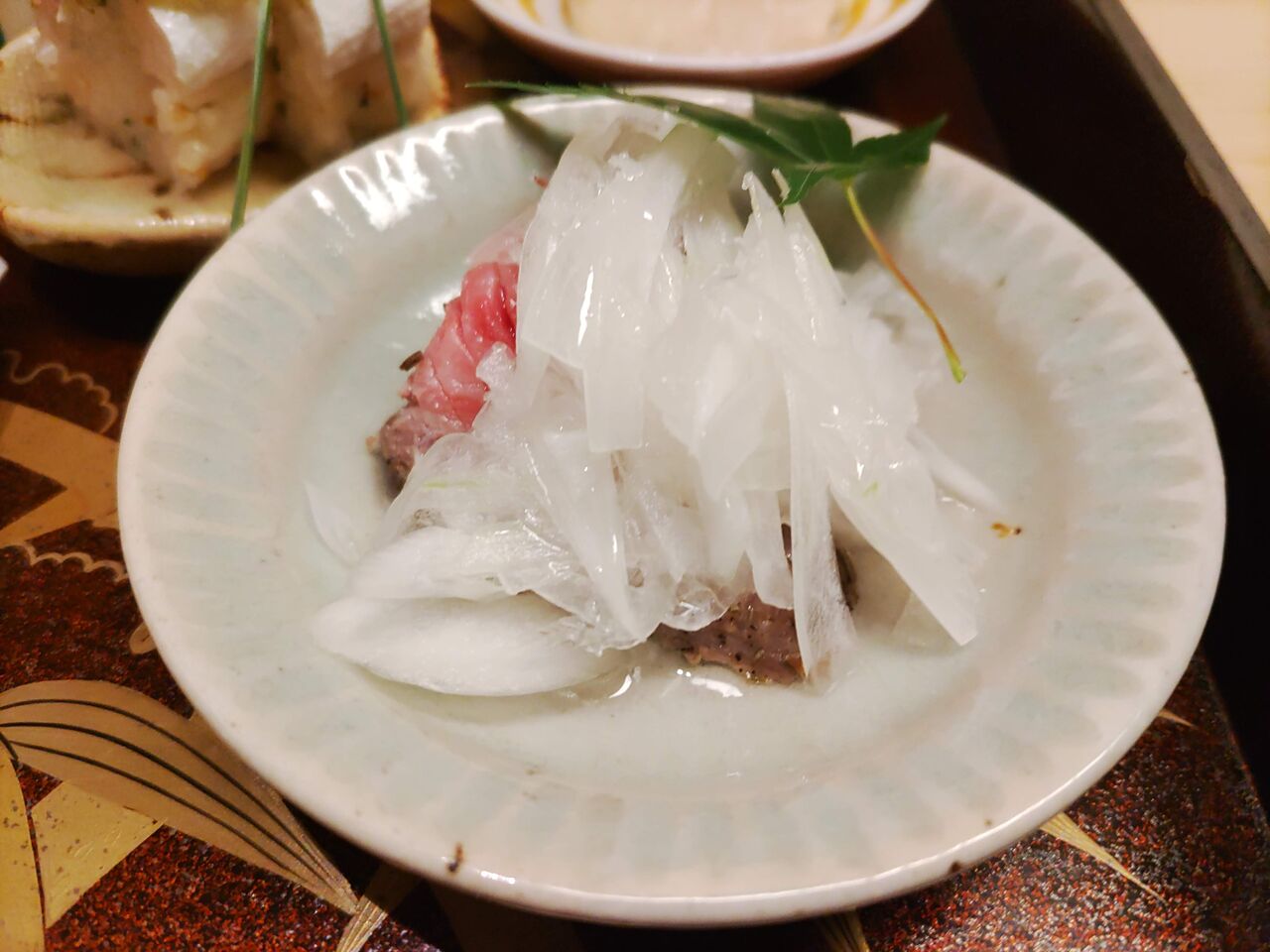かわはぎの身と、肝の酒蒸し。ポン酢ゼリー、梅肉醤油。