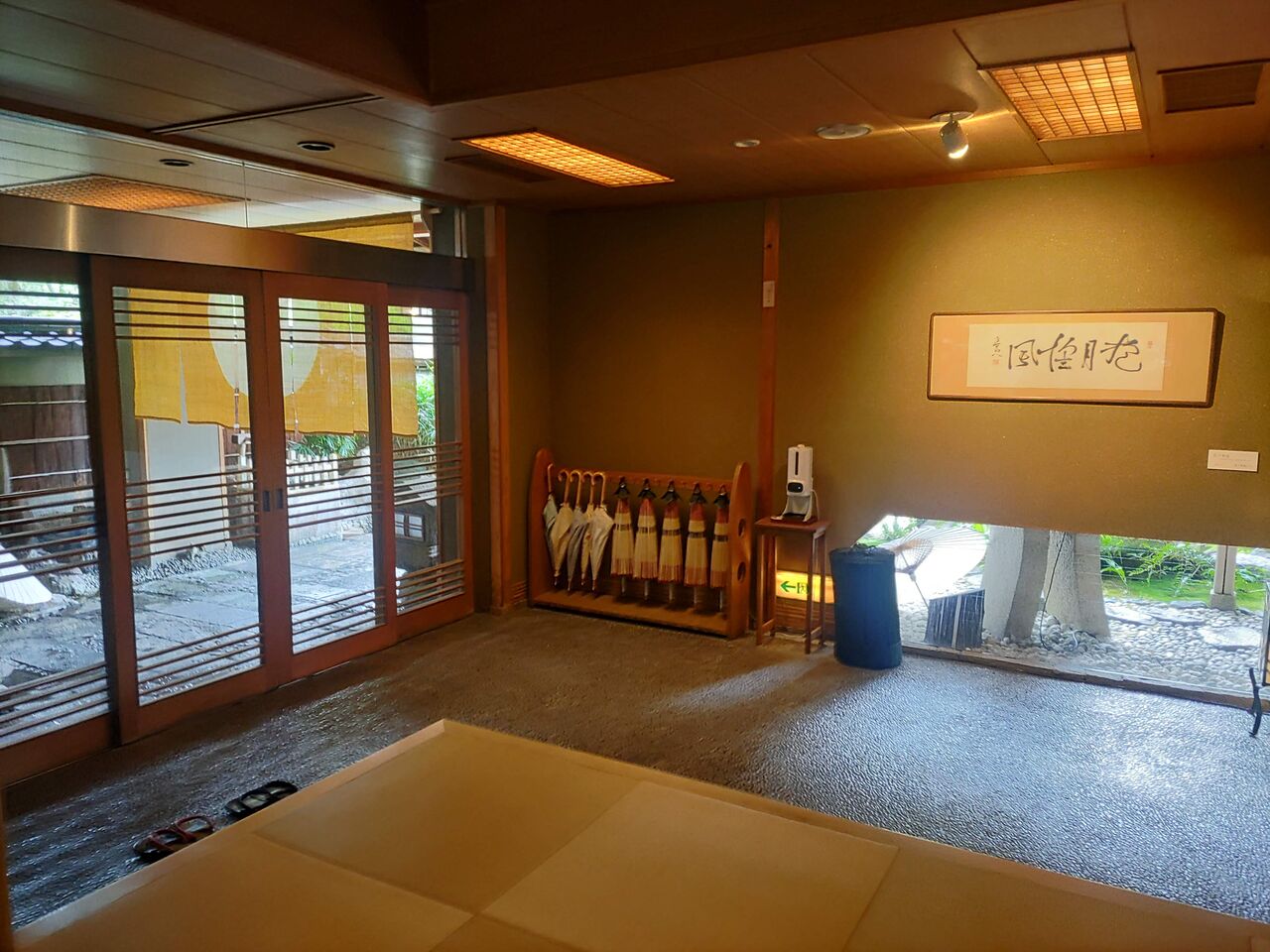 玄関前の送迎車へは、軒先から数歩ですが、仲居さん総出で番傘を差し出してご案内。