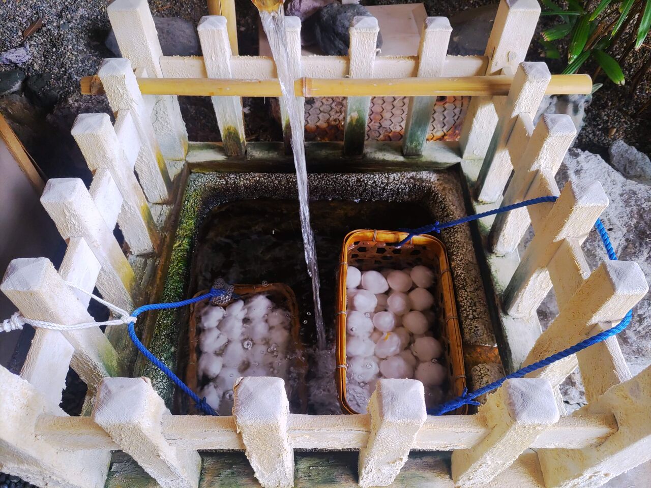 源泉では、あすの朝食の温泉玉子が作られていました。