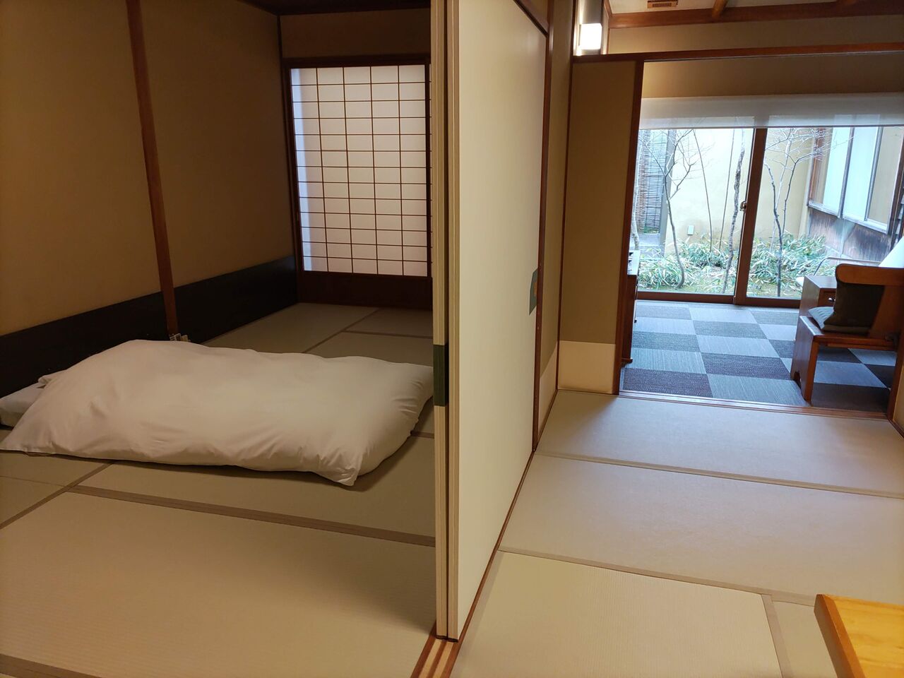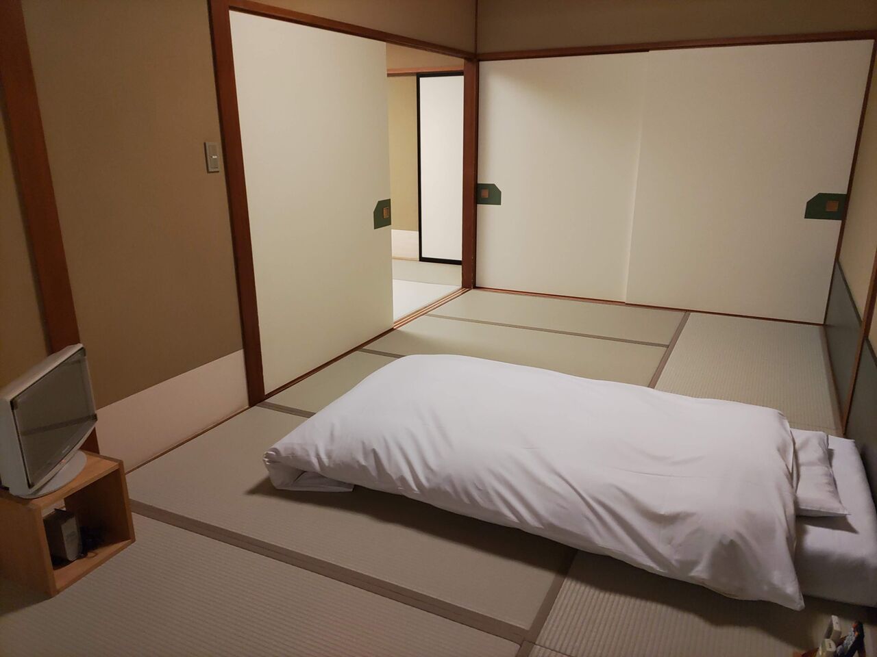 10分前に仲居さんが主室に入ってきました。寝室は別なので、布団はそのままで待ちます。