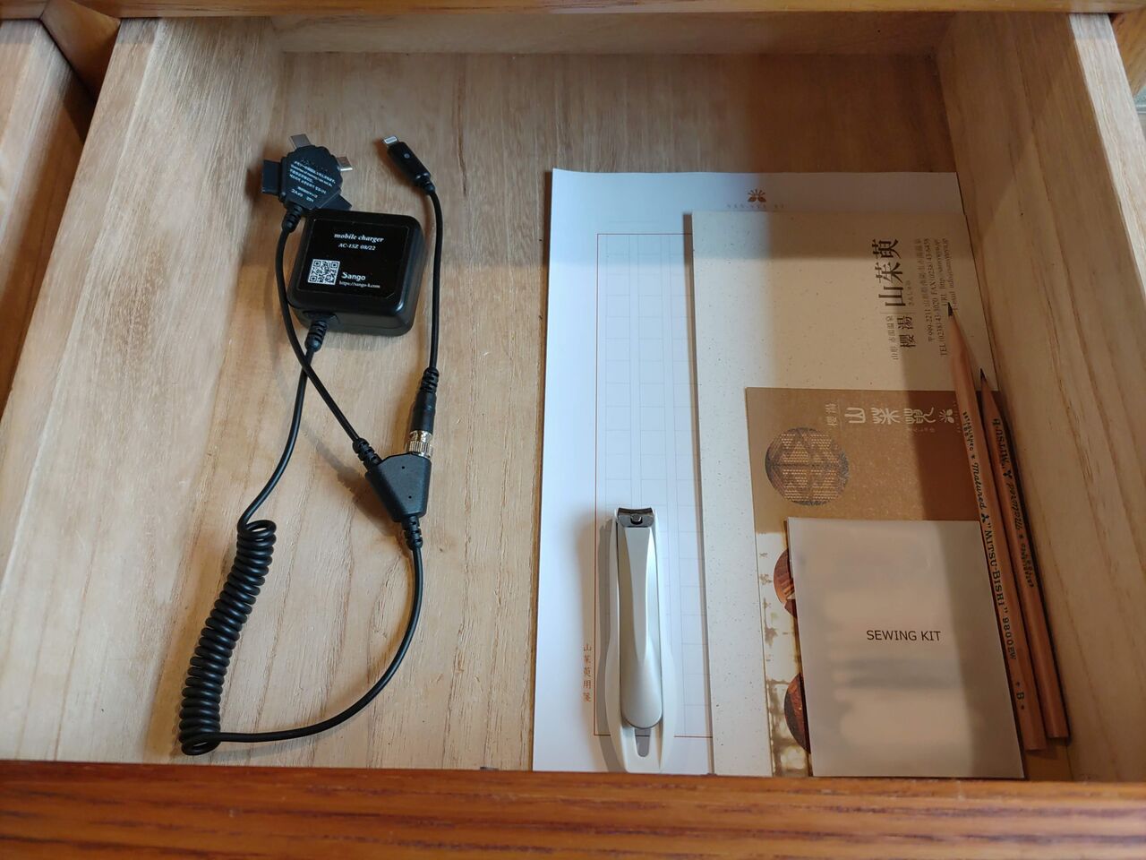 便箋、鉛筆、ソーイングセット、爪切り、充電器。