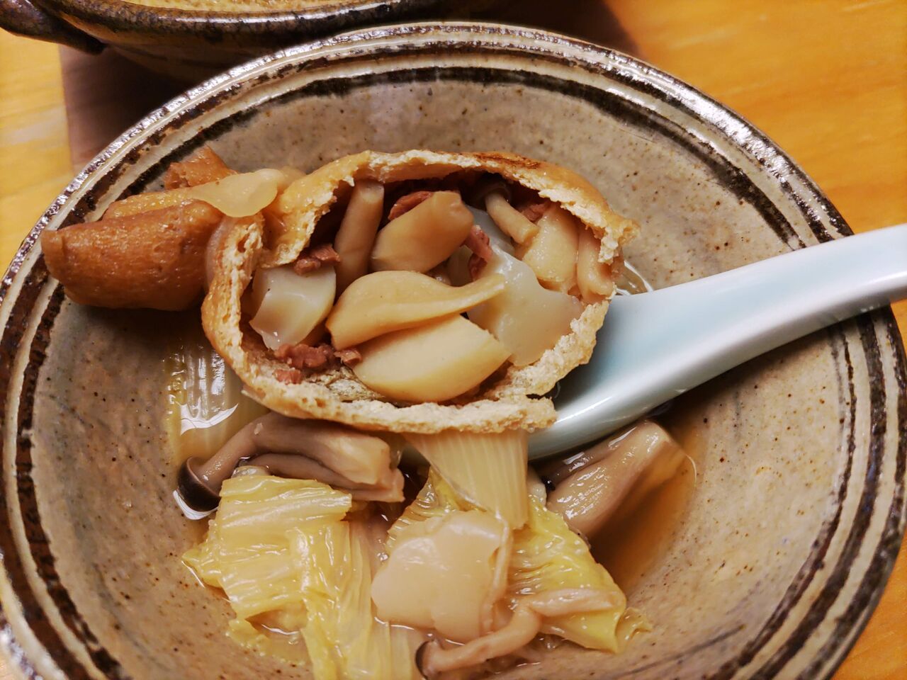 巾着の中身が、芋煮の具材になっていました。これ面白い。