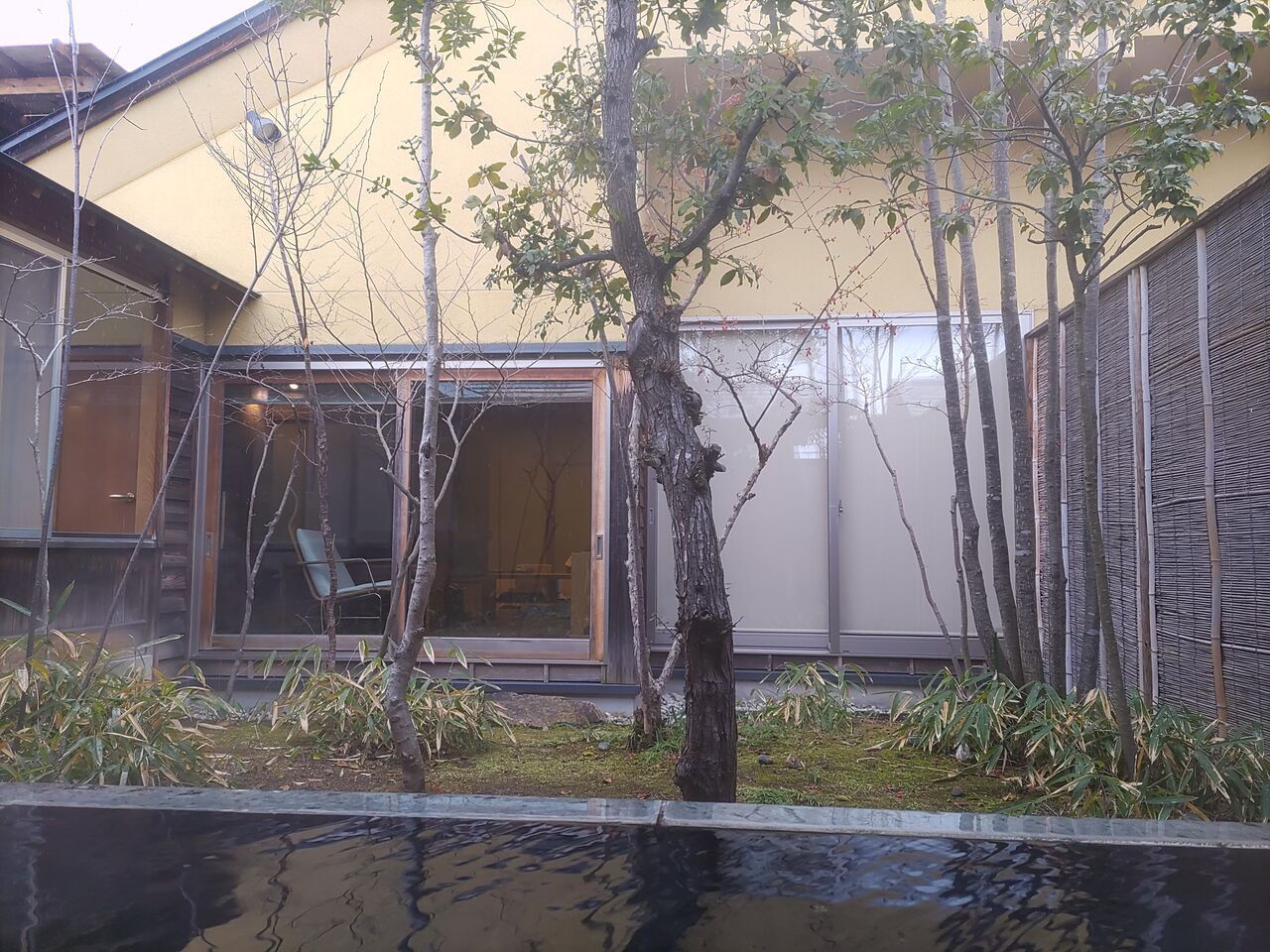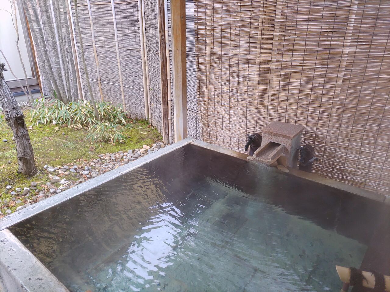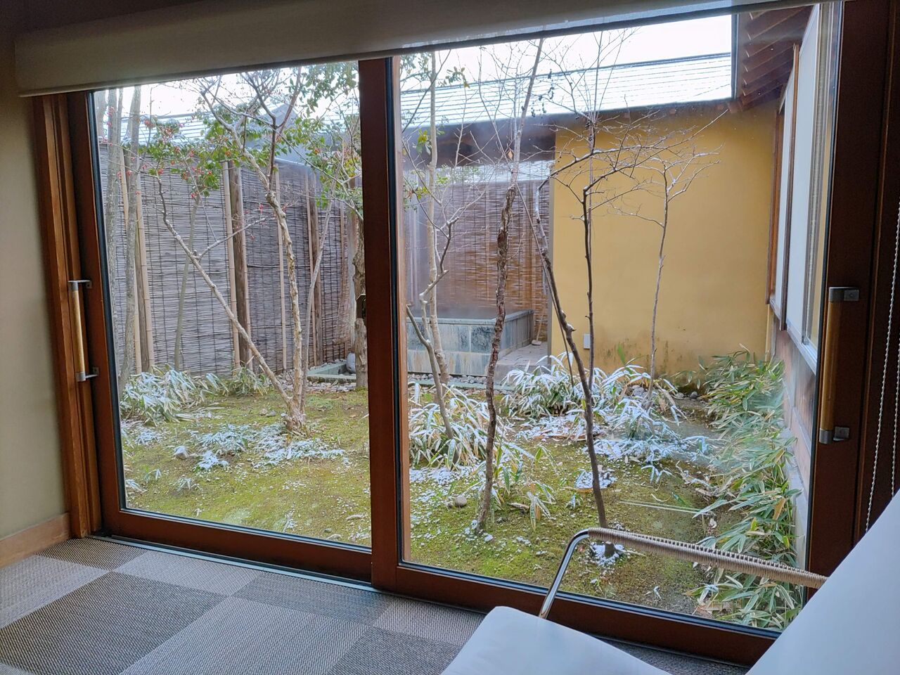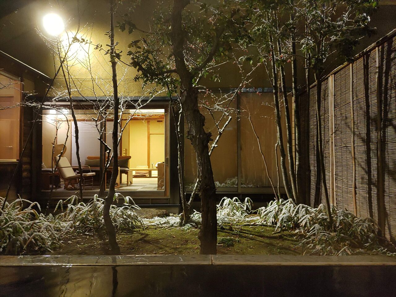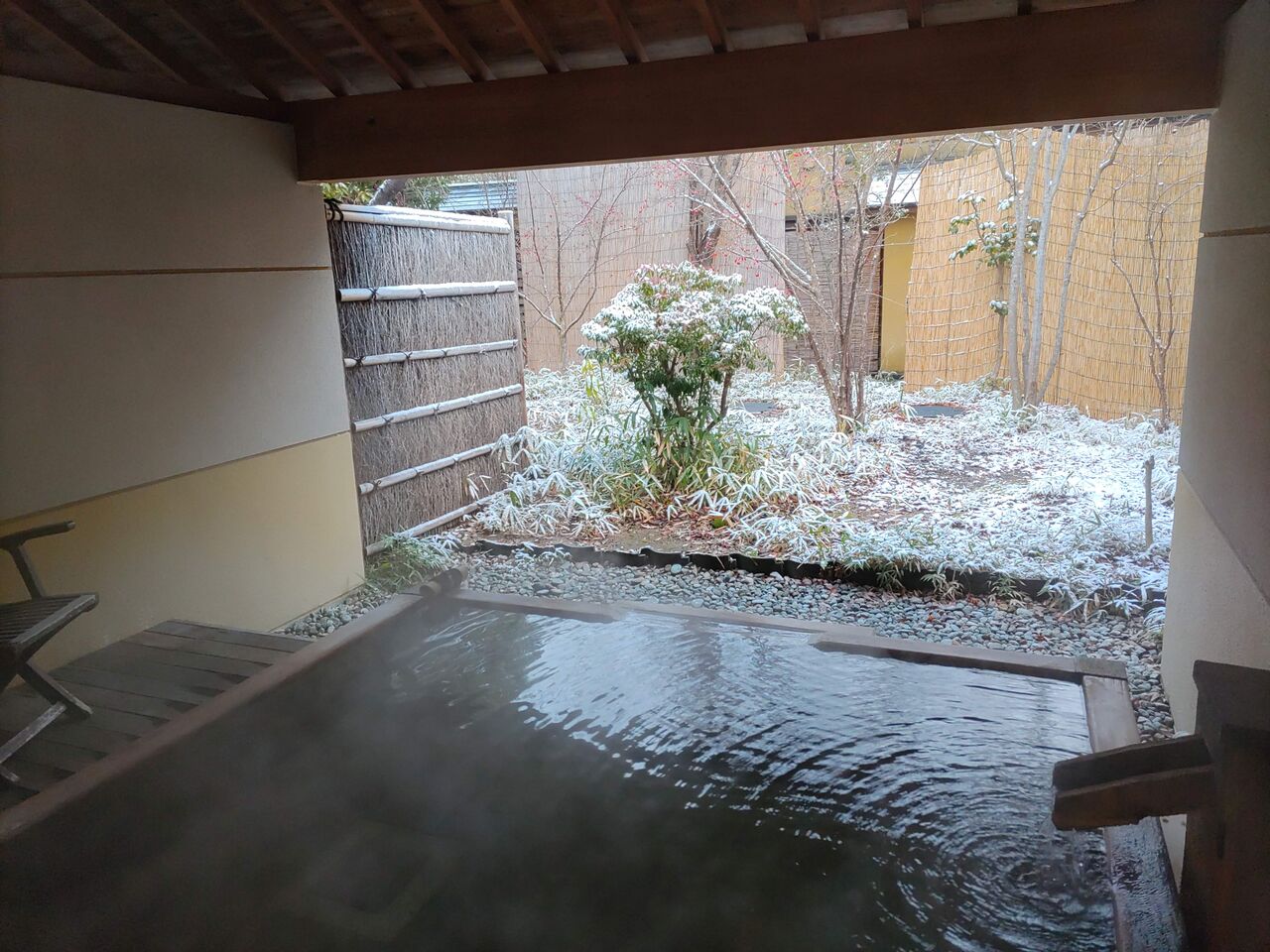 昨夜の雪がうっすら積もった中庭に面した露天風呂。