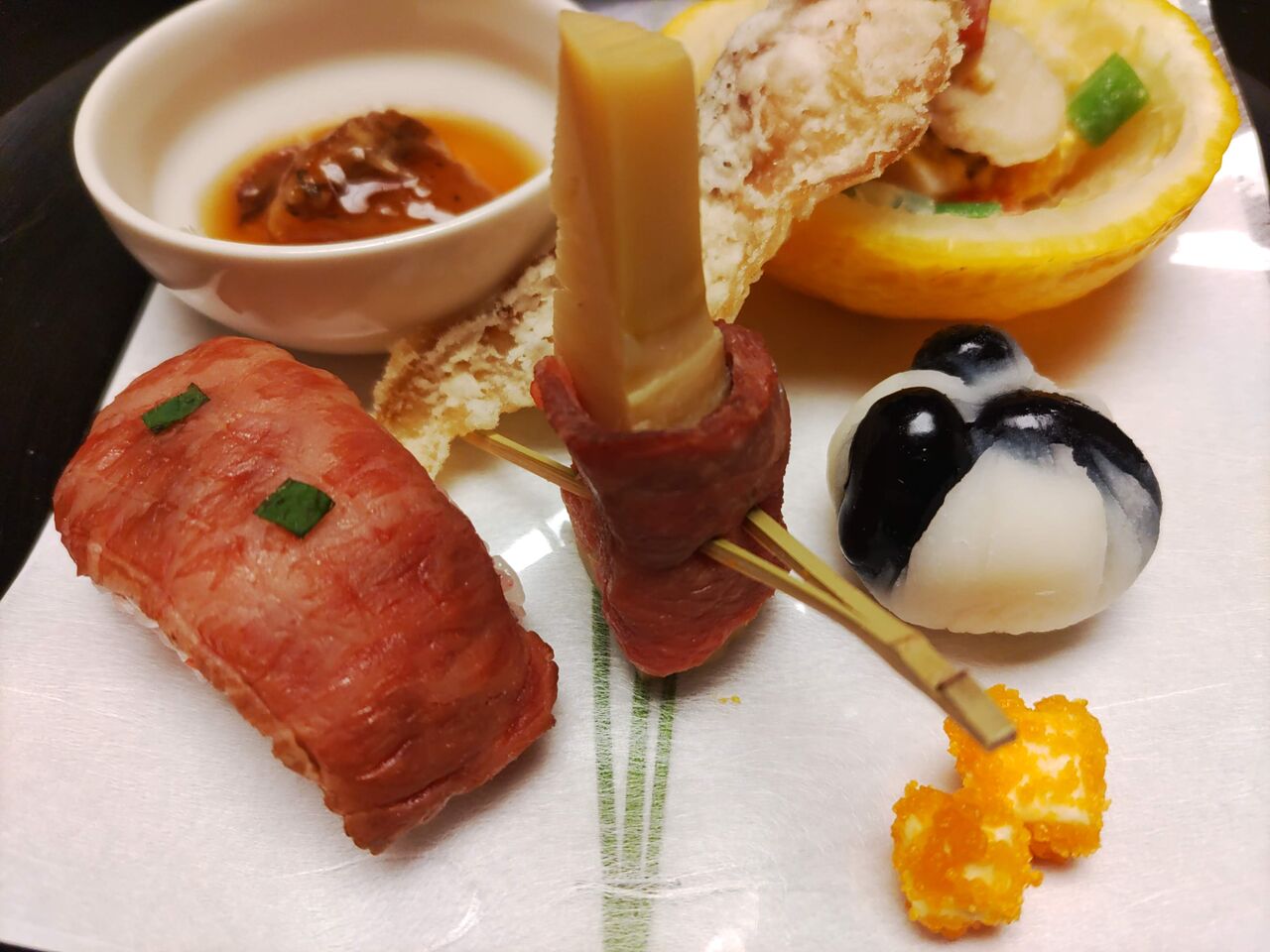 米沢牛握り 竹の子牛巻き 黒豆百合根 唐墨チーズ