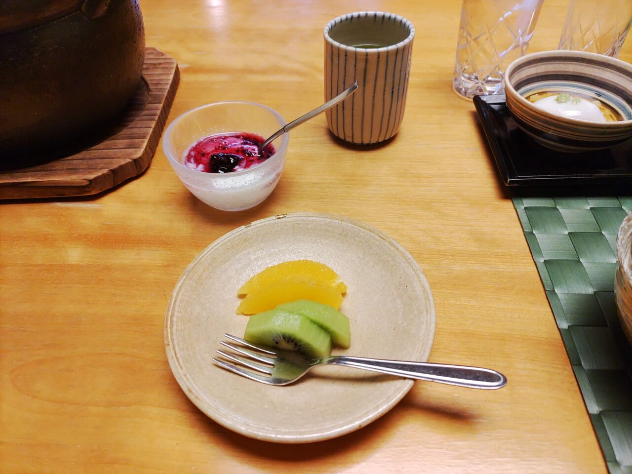 デザートは、キウイ、オレンジ、ブルーベリーヨーグルト。