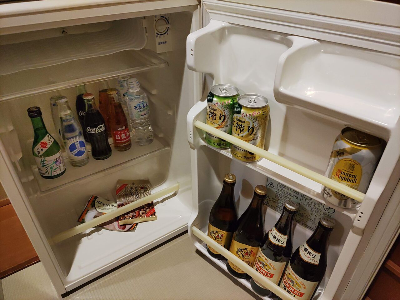 冷蔵庫は有料。中身は昔ながらの旅館ラインナップ。瓶ビールと瓶ジュース、おつまみ。