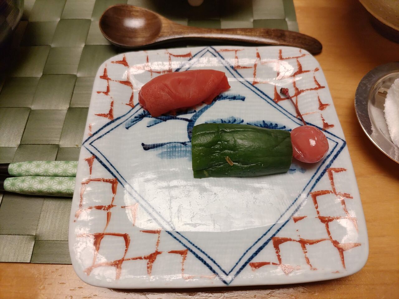 中身はおにぎり。竹包みの中に、塩むすびと小梅。