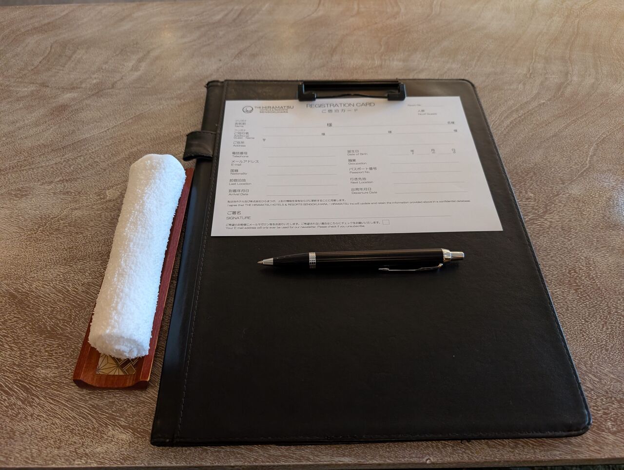 燕尾服のスタッフが持ってきた宿帳に記入してチェックイン。