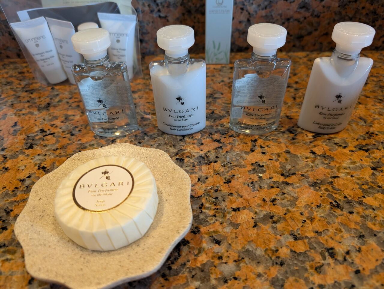 シャンプー、コンディショナーと石鹸は、ブルガリ。