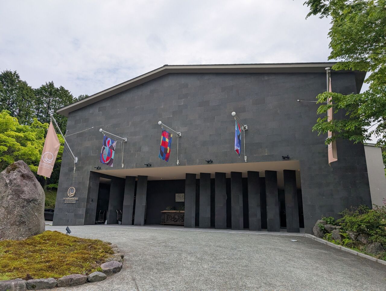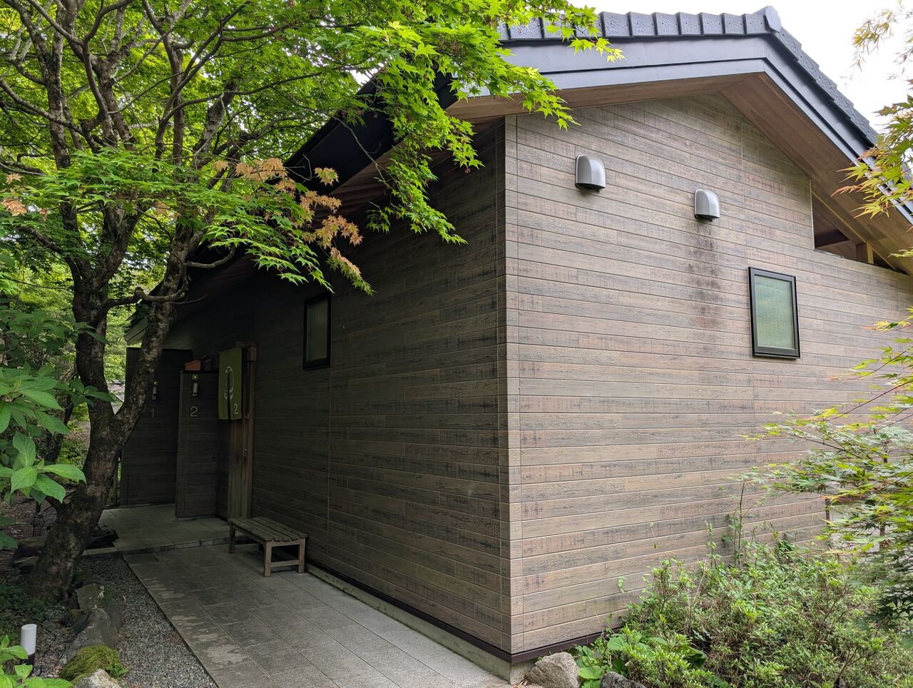 仙石原の自然の中にある、ダークグレーの外観の建物です。