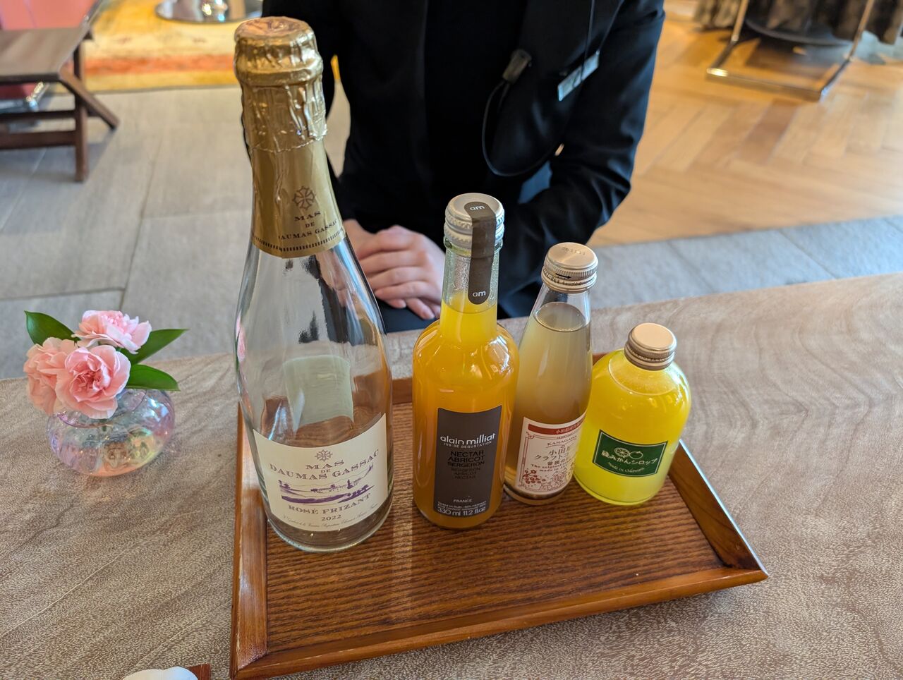 ロゼのスパークリングワイン、ランミリオアプリコットのネクター、小田原の梅を使用したクラフトコーラ、小田原青ミカンシロップ(ソーダ、又はアマレットでカクテル仕立て)。