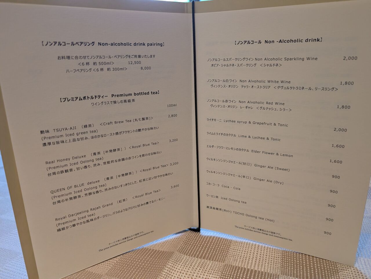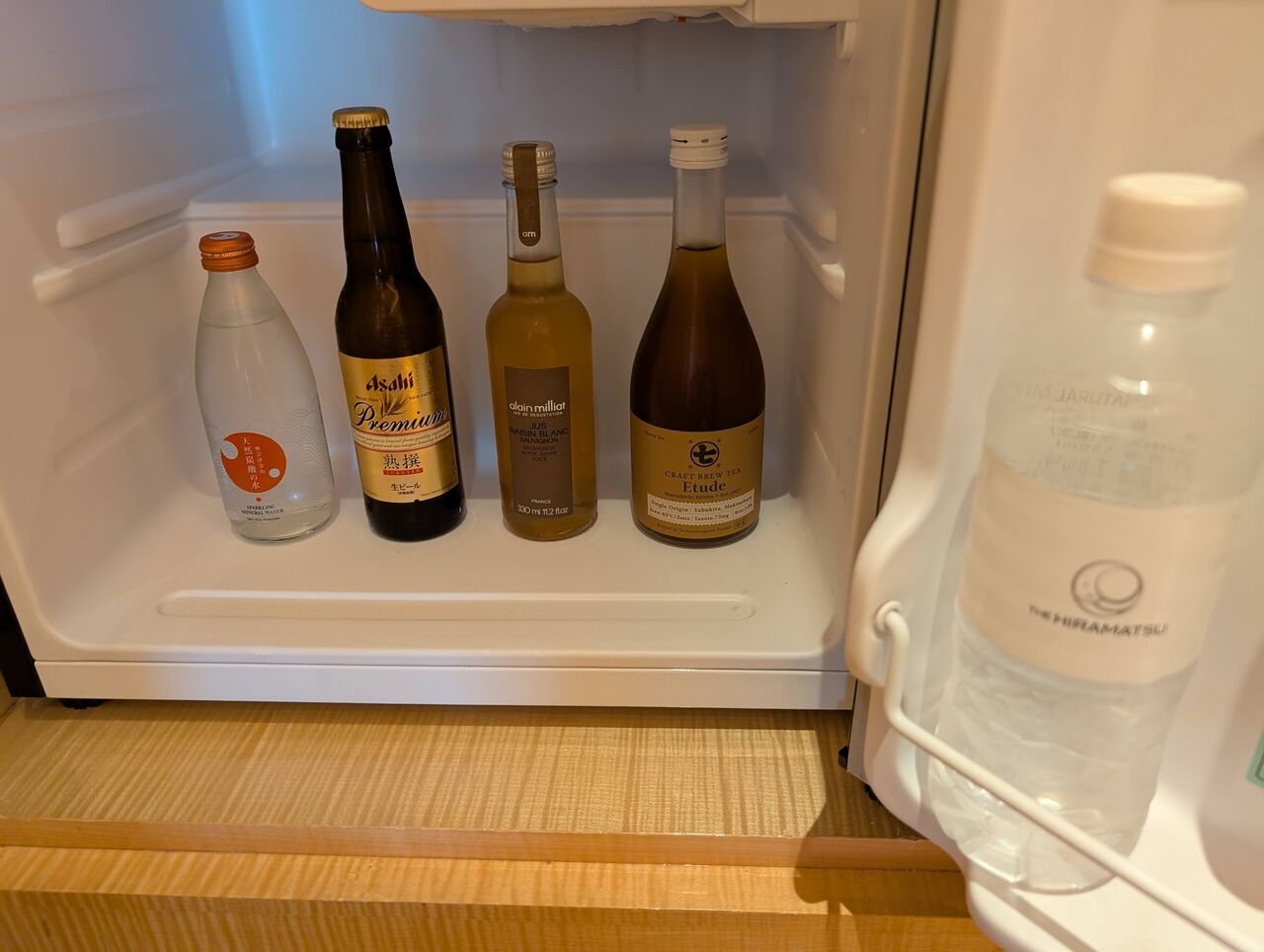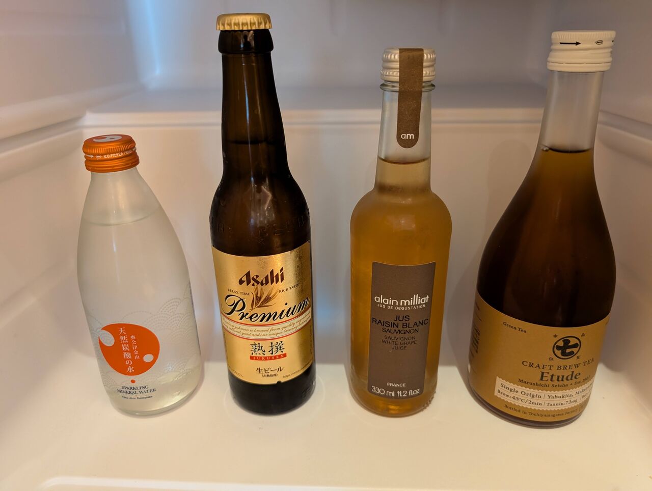 炭酸水、ビール、アランミニアのアップルジュース、ほうじ茶、ミネラルウォーター。