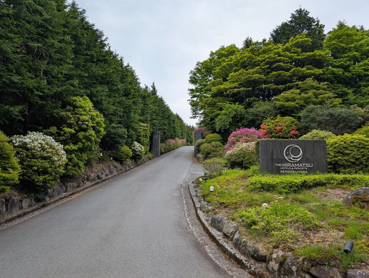 突き当りに、ひらまつ仙石原の看板。建物は坂の上です。