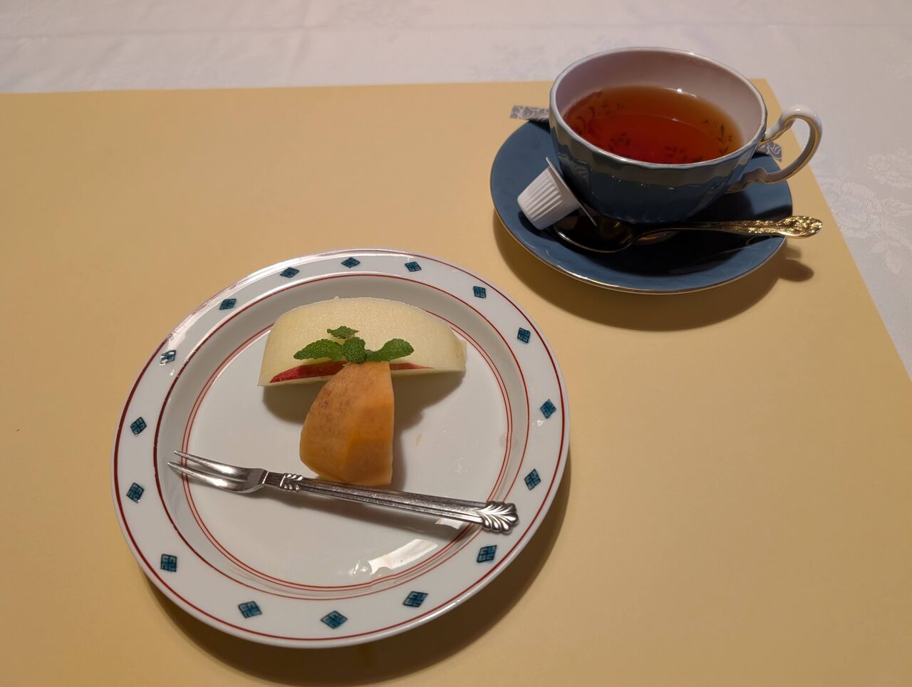 フルーツは、りんごと柿。コーヒーか紅茶。