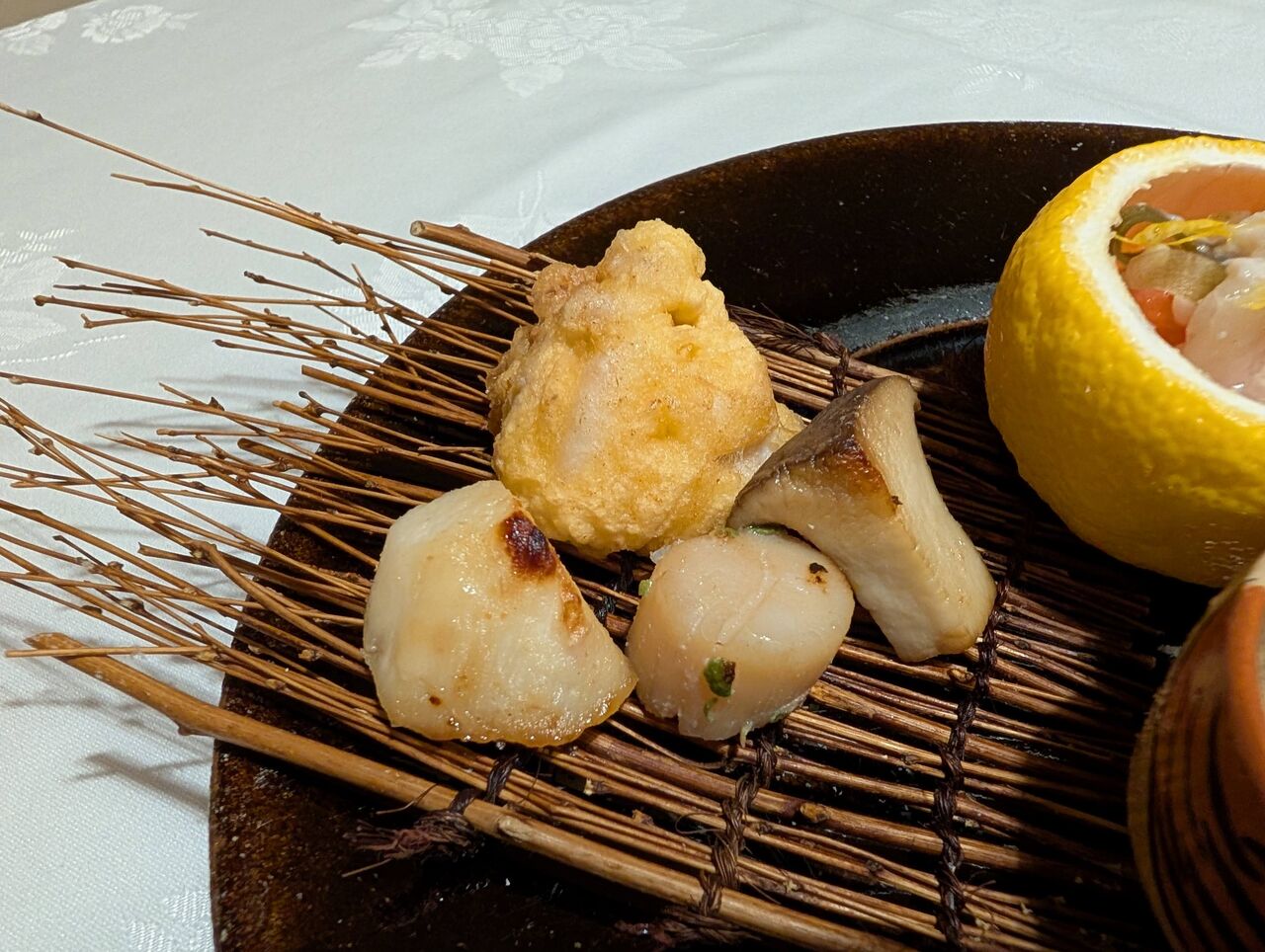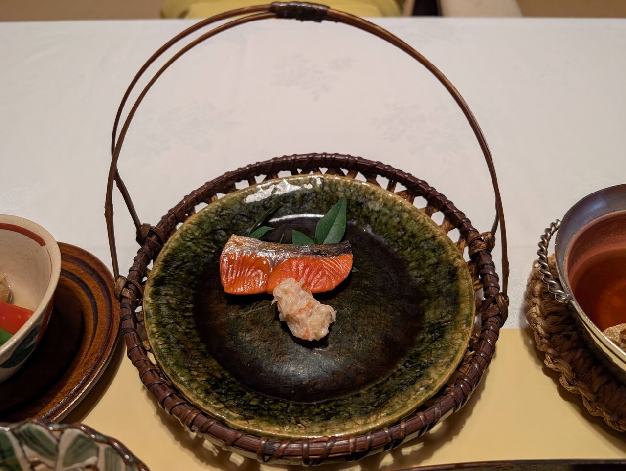 焼魚は、織部の焼物が美しい。